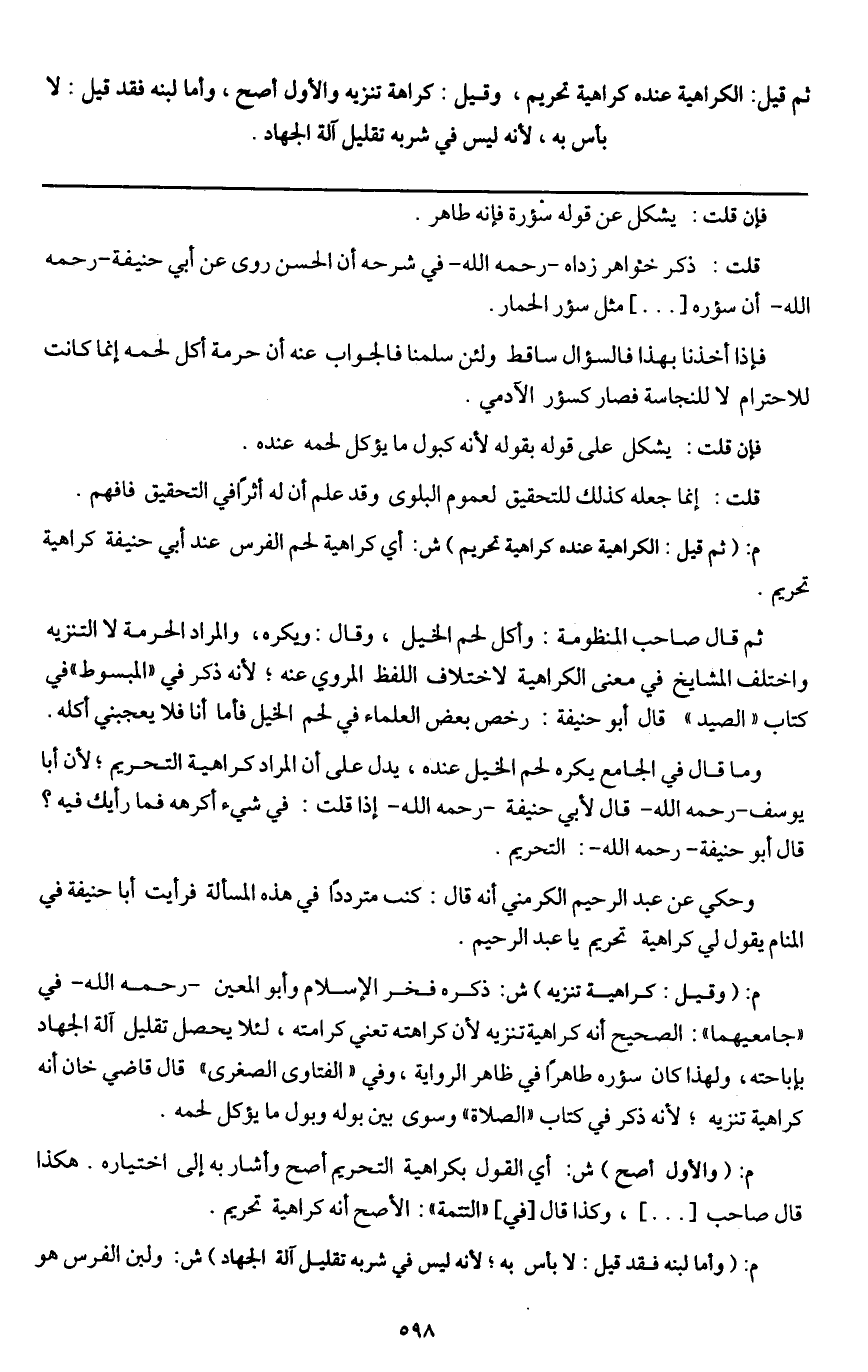 م: (ثم قيل: الكراهية عنده كراهية تحريم) ش: أي كراهية لحم الفرس عند أبي حنيفة كراهية تحريم.