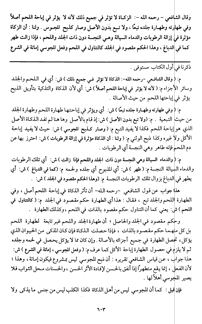 م: (وفي طهارته وطهارة جلده تبعا) ش: أي ويؤثر في إباحتها طهارة اللحم وطهارة الجلد من حيث التبعية. م: (ولا تبع بدون الأصل) ش: إذا قام بالأصل وهاهنا لم تفد الذكاة الأصل الذي هو إباحة اللحم فكذا لا يفيد التبع م: (وصار كذبح المجوسي) ش: حيث لا يفيد إباحة الأكل ولا غيره وكذا ذبح الوثني م: (ولنا: أن الذكاة مؤثرة في إزالة الرطوبات) ش: احترز بها عن دم اللحم فإنه طاهر وهي النجسة أي الرطوبات.