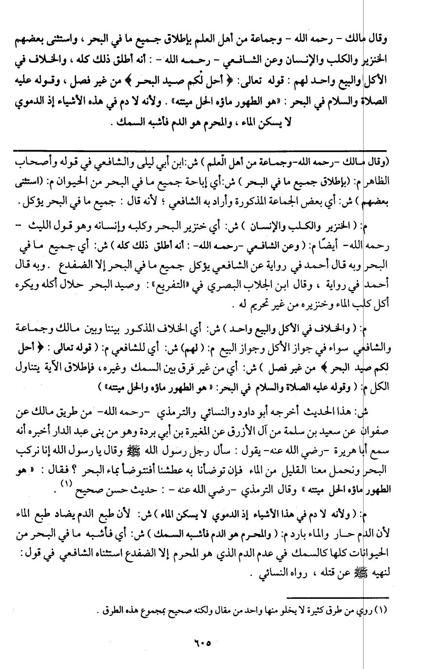 ش: هذا الحديث أخرجه أبو داود والنسائي والترمذي - رَحِمَهُ اللَّهُ - من طريق مالك عن صفوان عن سعيد بن سلمة من آل الأزرق عن المغيرة بن أبي بردة وهو من بني عبد الدار أخبره أنه سمع أبا هريرة - رَضِيَ اللَّهُ عَنْهُ - يقول: «سأل رجل رسول الله - صَلَّى اللَّهُ عَلَيْهِ وَسَلَّمَ - وقال يا رسول الله إنا نركب البحر ونحمل معنا القليل من الماء فإن توضأنا به عطشنا أفنتوضأ بماء البحر؟ فقال: " هو الطهور ماؤه الحل ميتته» وقال الترمذي - رَضِيَ اللَّهُ عَنْهُ -: حديث حسن صحيح.