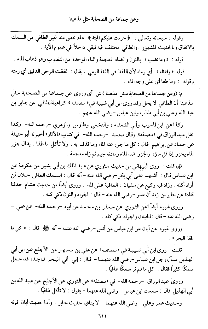 وكذا عن ابن المسيب وأبي الشعثاء، والنخعي وطاوس والزهري - رَحِمَهُ اللَّهُ - وكذا نقل عبد الرزاق في " مصنفه " وقال محمد - رَحِمَهُ اللَّهُ - في كتاب " الآثار " أخبرنا أبو حنيفة عن حماد عن إبراهيم قال: كل ما جزر عنه الماء وما قذف به، ولا تأكل ما طفا. يقال جزر الماء يجزر إذا قل ماؤه والجزر ضد الماء ومادته جيم ثم زاء معجمة.