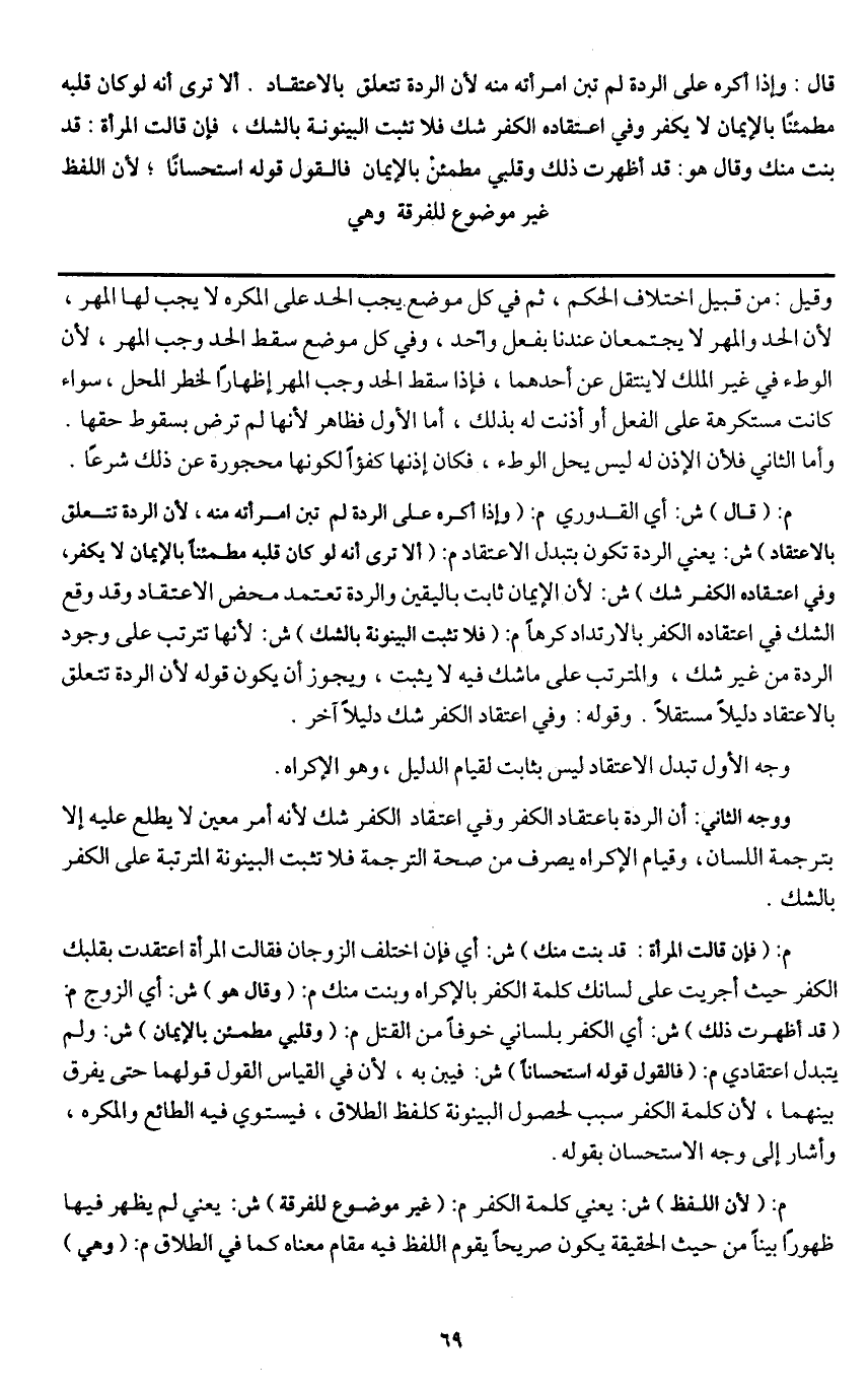 ووجه الثاني: أن الرد باعتقاد الكفر وفي اعتقاد الكفر شك لأنه أمر معين لا يطلع عليه إلا بترجمة اللسان، وقيام الإكراه يصرف من صحة الترجمة فلا تثبت البينونة المترتبة على الكفر بالشك.