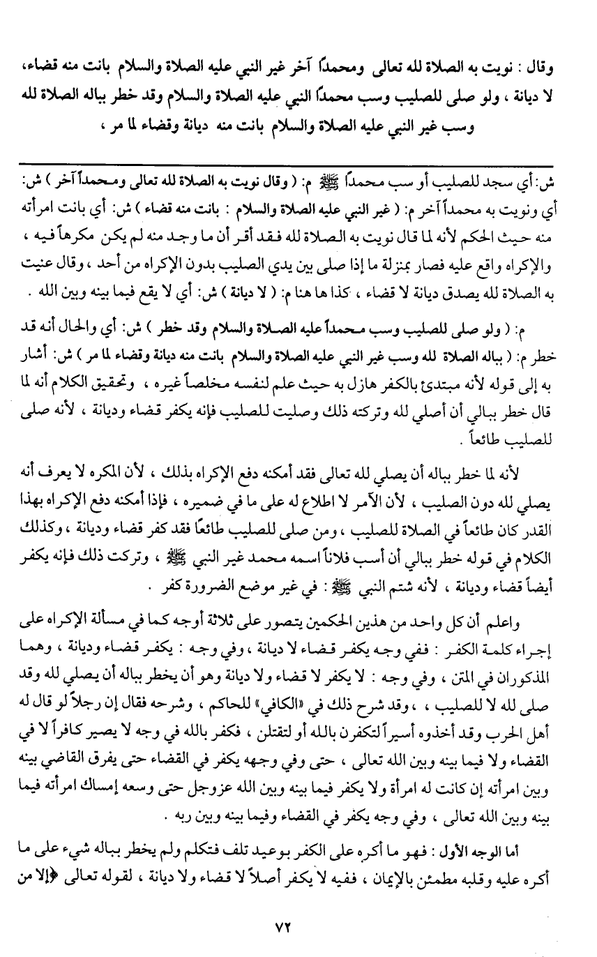 لأنه لما خطر بباله أن يصلي لله تعالى فقد أمكنه دفع الإكراه بذلك، لأن المكره لا يعرف أنه يصلي لله دون الصليب، لأن الآمر لا اطلاع له على ما في ضميره، فإذا أمكنه دفع الإكراه بهذا القدر كان طائعا في الصلاة للصليب، ومن صلى للصليب طائعا فقد كفر قضاء وديانة، وكذلك الكلام في قوله خطر ببالي أن أسب فلانا اسمه محمد غير النبي - صَلَّى اللَّهُ عَلَيْهِ وَسَلَّمَ -، وتركت ذلك فإنه يكفر أيضا قضاء وديانة، لأنه شتم النبي - صَلَّى اللَّهُ عَلَيْهِ وَسَلَّمَ -: في غير موضع الضرورة كفر.