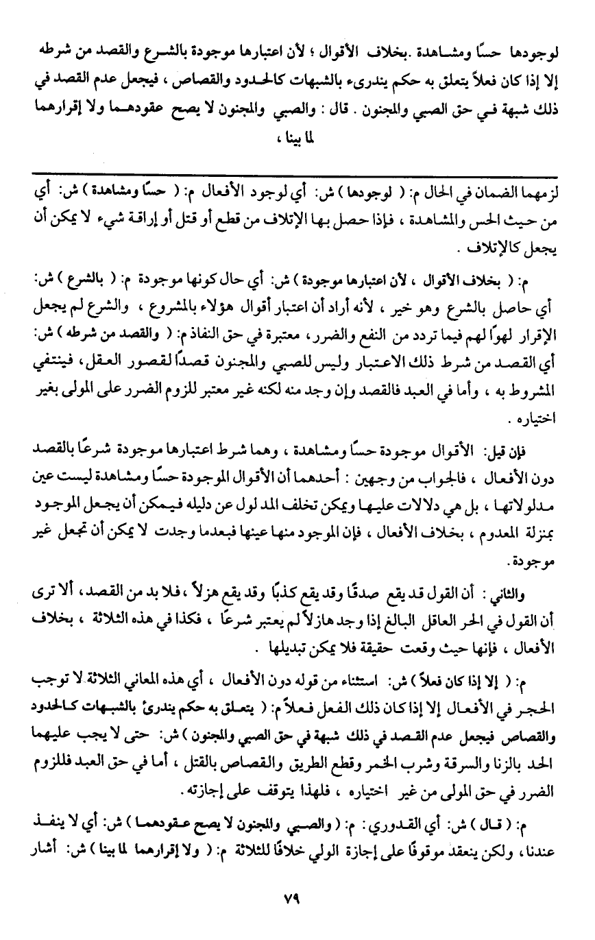 م: (إلا إذا كان فعلا) ش: استثناء من قوله دون الأفعال، أي هذه المعاني الثلاثة لا توجب الحجر في الأفعال إلا إذا كان ذلك الفعل فعلا م: (يتعلق به حكم يندرئ بالشبهات كالحدود والقصاص فيجعل عدم القصد في ذلك شبهة في حق الصبي والمجنون) ش: حتى لا يجب عليهما الحد بالزنا والسرقة وشرب الخمر وقطع الطرق والقصاص بالقتل، أما في حق العبد فللزوم الضرر في حق المولى من غير اختياره، فلهذا يتوقف على إجازته.