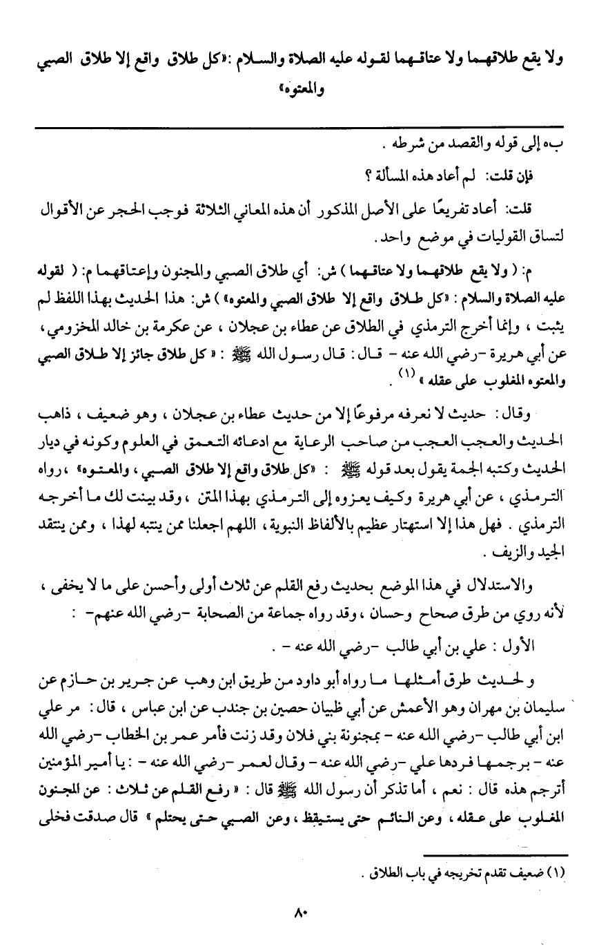 وقال: حديث لا نعرفه مرفوعا إلا من حديث عطاء بن عجلان، وهو ضعيف، ذاهب الحديث والعجب العجب من صاحب الرعاية مع ادعائه التعمق في العلوم وكونه في ديار الحديث وكتبه الجمة يقول بعد قوله - صَلَّى اللَّهُ عَلَيْهِ وَسَلَّمَ -: «كل طلاق واقع إلا طلاق الصبي، والمعتوه» ، رواه الترمذي، عن أبي هريرة وكيف يعزوه إلى الترمذي بهذا المتن، وقد بينت لك ما أخرجه الترمذي. فهل هذا إلا استهتار عظيم بالألفاظ النبوية، اللهم اجعلنا ممن ينتبه لهذا، وممن ينتقد الجيد والزيف.