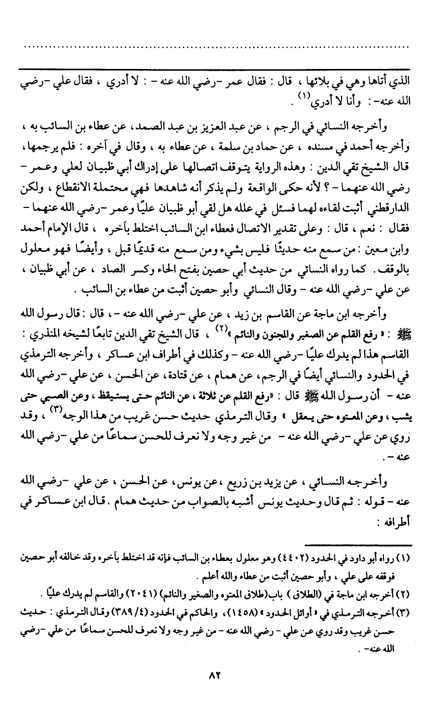 وأخرجه ابن ماجه عن القاسم بن زيد، عن علي - رَضِيَ اللَّهُ عَنْهُ -، قال: قال رسول الله - صَلَّى اللَّهُ عَلَيْهِ وَسَلَّمَ -: «رفع القلم عن الصغير والمجنون والنائم» ، قال الشيخ تقي الدين تابعا لشيخه المنذري: القاسم هذا لم يدرك عليا - رَضِيَ اللَّهُ عَنْهُ - وكذلك في أطراف ابن عساكر، وأخرجه الترمذي في الحدود والنسائي أيضا في الرجم، عن همام، عن قتادة، عن الحسن، عن علي - رَضِيَ اللَّهُ عَنْهُ - أن رسول الله - صَلَّى اللَّهُ عَلَيْهِ وَسَلَّمَ - قال: «رفع القلم عن ثلاثة، عن النائم حتى يستيقظ، وعن الصبي حتى يشب، وعن المعتوه حتى يعقل» وقال الترمذي حديث حسن غريب من هذا الوجه، وقد روي عن علي - رَضِيَ اللَّهُ عَنْهُ - من غير وجه ولا نعرف للحسن سماعا من على - رَضِيَ اللَّهُ عَنْهُ -.