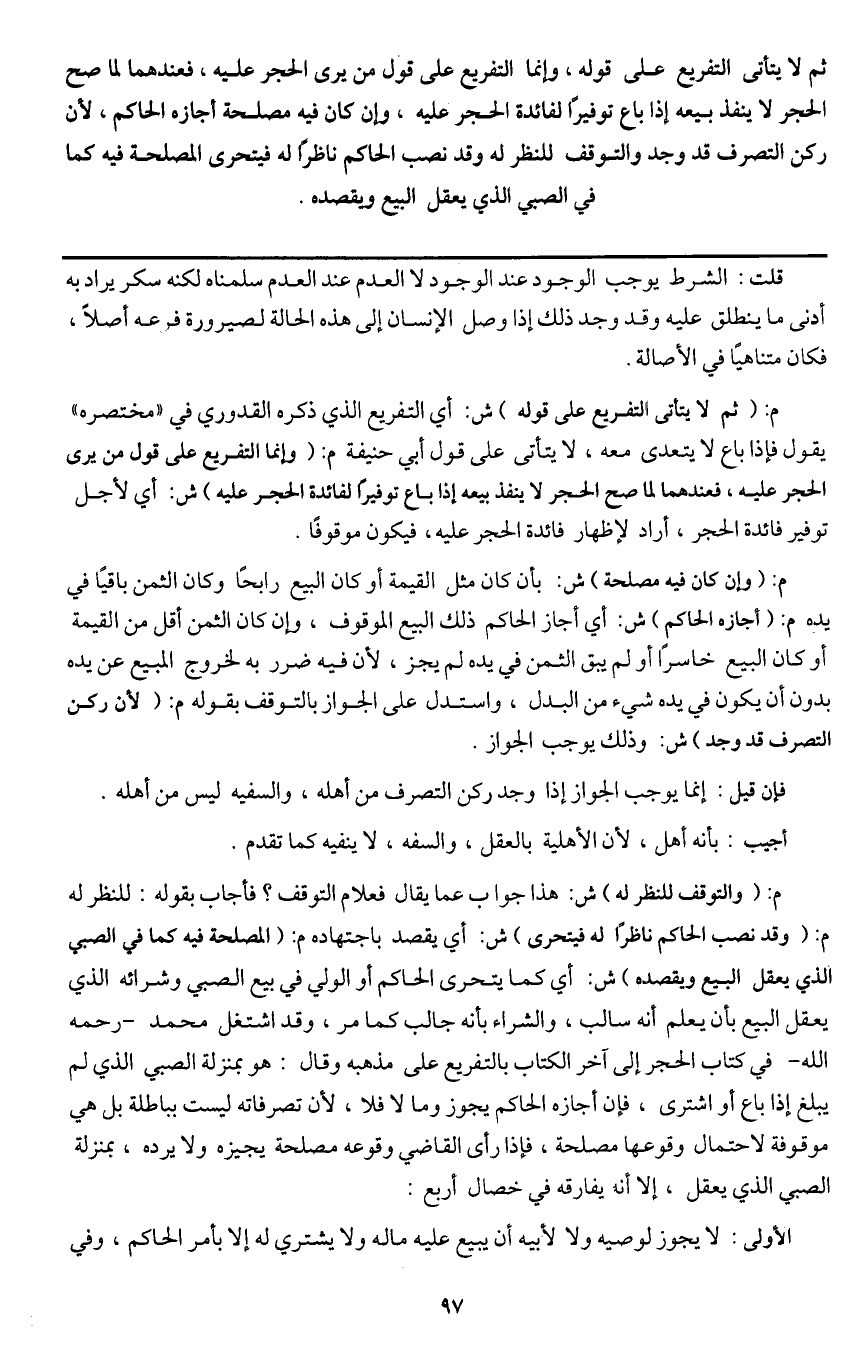 م: (والتوقف للنظر له) ش: هذا جواب عما يقال فعلام التوقف؟ فأجاب بقوله: للنظر له م: (وقد نصب الحاكم ناظرا له فيتحرى) ش: أي يقصد باجتهاده م: (المصلحة فيه كما في الصبي الذي يعقل البيع ويقصده) ش: أي كما يتحرى الحاكم أو الولي في بيع الصبي وشرائه الذي يعقل البيع بأن يعلم أنه سالب، والشراء بأنه جالب كما مر، وقد اشتغل محمد - رَحِمَهُ اللَّهُ - في كتاب الحجر إلى آخر الكتاب بالتفريع على مذهبه وقال: هو بمنزلة الصبي الذي لم يبلغ إذا باع أو اشترى، فإن أجازه الحاكم يجوز وما لا فلا، لأن تصرفاته ليست بباطلة بل هي موقوفة لاحتمال وقوعها مصلحة، فإذا رأى القاضي وقوعه مصلحة يجيزه ولا يرده، بمنزلة الصبي الذي يعقل، إلا أنه يفارقه في خصال أربع: