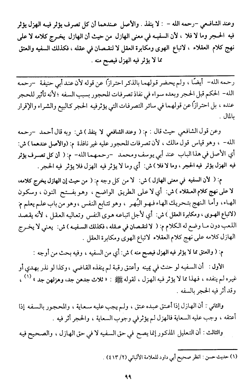 الأول: أن السفيه لو حنث في يمينه وأعتق رقبة لم ينفذه القاضي، وكذا لو نذر بهدي أو غيره لم ينفذه، فهذا مما لا يؤثر فيه الهزل، لقوله - صَلَّى اللَّهُ عَلَيْهِ وَسَلَّمَ -: «ثلاث جدهن جد، وهزلهن جد» ، وقد أثر فيه الحجر بالسفه.