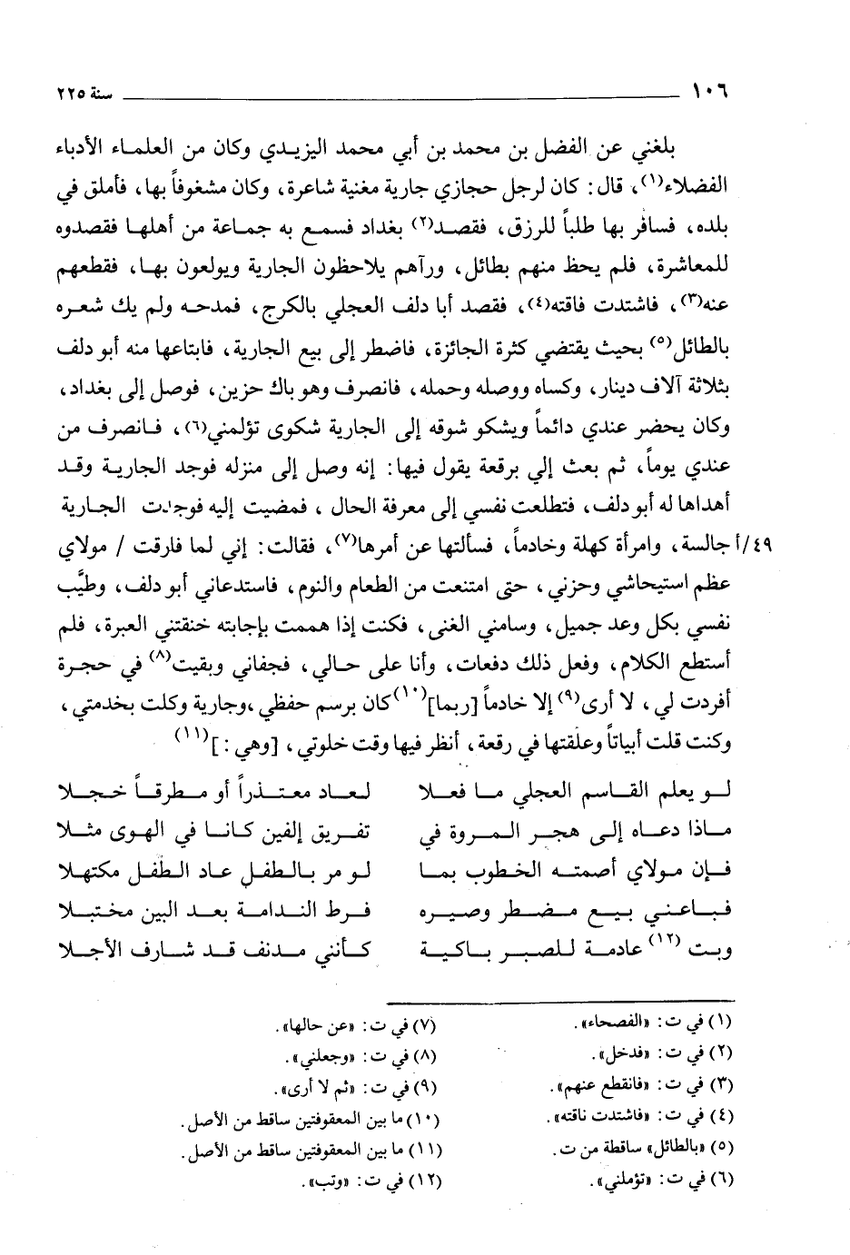 بلغني عن الفضل بْن محمد بْن أبي محمد اليزيدي وَكَانَ من العلمَاء الأدباء الفضلاء [1] ، قَالَ: كَانَ لرجل حجازي جارية مغنية شاعرة، وَكَانَ مشغوفا بِهَا، فأملق فِي بلده، فسافر بِهَا طلبا للرزق، فقصد [2] بغداد فسمع به جمَاعة من أهلها فقصدوه للمعاشرة، فلم يحظ منهم بطائل، ورآهم يلاحظون الجارية ويولعون بِهَا، فقطعهم عنه [3] ، فاشتدت فاقته [4] ، فقصد أبا دلف العجلي بالكرج، فمدحه ولم يك شعره بالطائل [5] بحيث يقتضي كثرة الجائزة، فاضطر إِلَى بيع الجارية، فابتاعها منه أبو دلف بثلاثة آلاف دينار، وكساه ووصله وحمله، فانصرف وَهُوَ باك حزين، فوصل إِلَى بغداد، وَكَانَ يحضر عندي دائمَا ويشكو شوقه إِلَى الجارية شكوى تؤلمني [6] ، فانصرف من عندي يومَا، ثم بعث إلي برقعة يقول فيها: إنه وصل إِلَى منزله فوجد الجارية وقد أهداها لَهُ أبو دلف، فتطلعت نفسي إِلَى معرفة الحال، فمضيت إليه فوجدت الجارية 49/ أجالسة، وامرأة كهلة وخادمَا، فسألتها عن أمرها [7] ، فقالت: إني لمَا فارقت/ مولاي عظم استيحاشي وحزني، حَتَّى امتنعت من الطعام والنوم، فاستدعاني أبو دلف، وطيّب نفسي بكل وعد جميل، وسامني الغنى، فكنت إذا هممت بإجابته خنقتني العبرة، فلم أستطع الكلام، وفعل ذلك دفعات، وأنا عَلَى حالي، فجفاني وبقيت [8] فِي حجرة أفردت لي، لا أرى [9] إلا خادمَا [ربمَا] [10] كَانَ برسم حفظي، وجارية وكلت بخدمتي، وكنت قلت أبياتا وعلقتها فِي رقعة، أنظر فيها وقت خلوتي، [وهي:] [11]