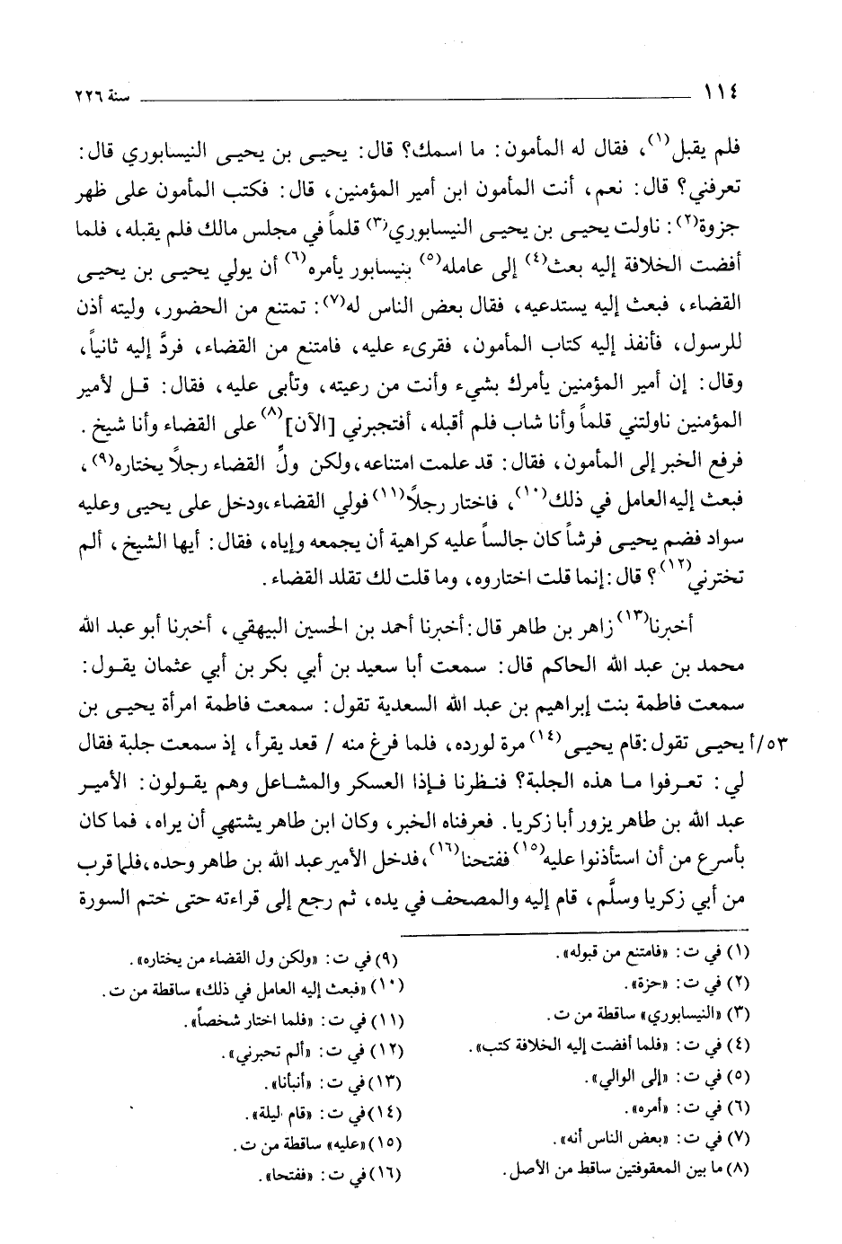 سمعت فاطمة بِنْت إبراهيم بْن عبد الله السعدية تقول: سمعت فاطمة امرأة يحيى بن 53/ أيحيى تقول: قام يحيى [14] مرة لورده، فلمَا فرغ منه/ قعد يقرأ، إذ سمعت جلبة فَقَالَ لي: تعرفوا مَا هذه الجلبة؟ فنظرنا فإذا العسكر والمشاعل وهم يقولون: الأمير عبد الله بْن طاهر يزور أبا زكريا. فعرفناه الخبر، وَكَانَ ابْن طاهر يشتهي أن يراه، فمَا كَانَ بأسرع من أن استأذنوا عَلَيْهِ [15] ففتحنا [16] ، فدخل الأمير عبد الله بْن طاهر وحده، فلمَا قرب من أبي زكريا وسلم، قام إليه والمصحف فِي يده، ثم رجع إلى قراءته حتى ختم السورة