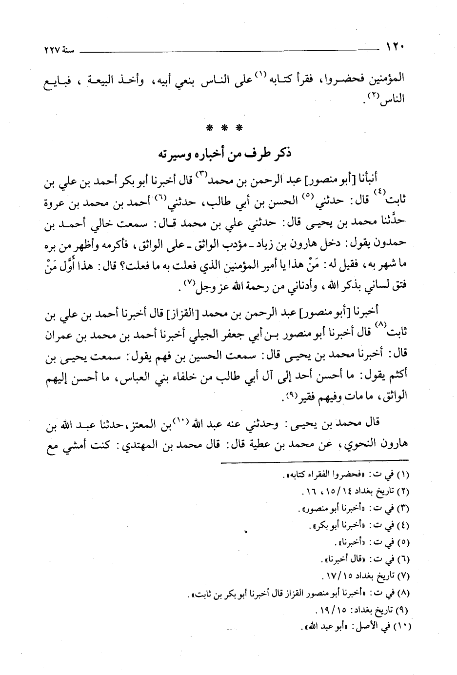 أَخْبَرَنَا [أبو منصور] عبد الرحمن بن محمد [القزاز] قال أخبرنا أحمد بن على بن ثابت [8] قال أخبرنا أبو منصور بْن أبي جعفر الجيلي أَخْبَرَنَا أَحْمَد بْن مُحَمَّد بْن عمران قال: أخبرنا مُحَمَّد بْن يحيى قَالَ: سمعت الحسين بْن فهم يقول: سمعت يحيى بْن أكثم يقول: مَا أحسن أحد إِلَى آل أبي طالب من خلفاء بني العباس، مَا أحسن إليهم الواثق، مَا مَات وفيهم فقير [9] .