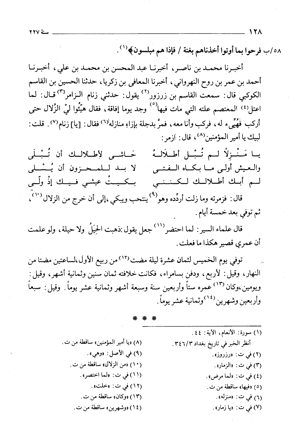 أَخْبَرَنَا محمد بْن ناصر، أَخْبَرَنَا عبد المحسن بْن محمد بْن علي، أَخْبَرَنَا أحمد بْن عمر بْن روح النهرواني، أَخْبَرَنَا المعافى بْن زكريا، حَدَّثَنَا الحسين بْن القاسم الكوكبي قَالَ: سمعت القاسم بْن زرزور [2] يقول: حدثني زنام الزامر [3] قَالَ: لمَا اعتل [4] المعتصم علته التي مَات فيها [5] وجد يومَا إفاقة، فَقَالَ هيئوا لي الزلال حَتَّى أركب فهيئ لَهُ، فركب وأنا معه، فمر بدجلة بإزاء منازلة [6] فَقَالَ: [يَا] زنام [7] . قلت: