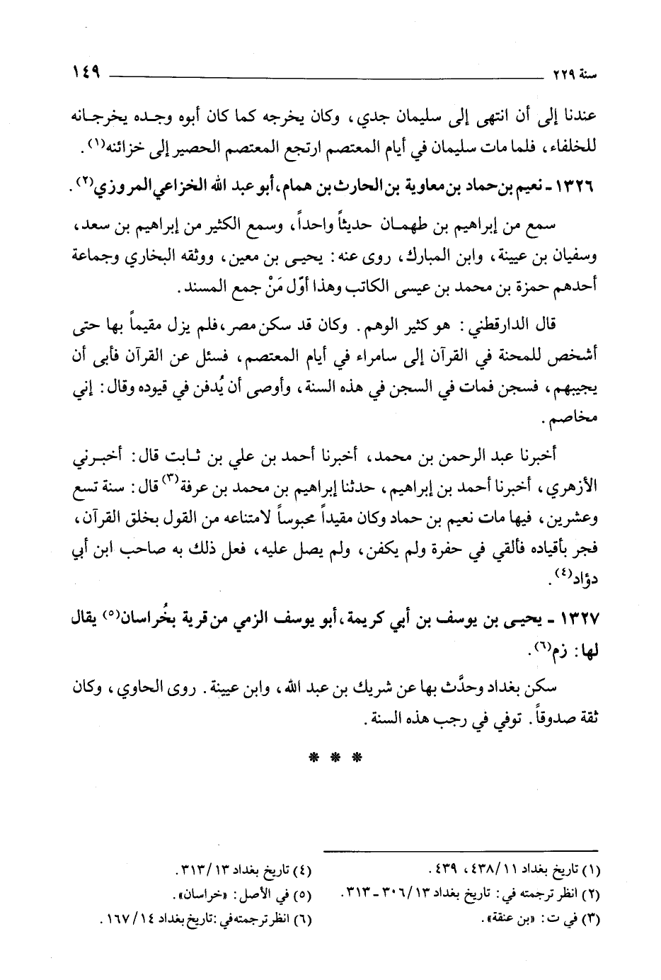أَخْبَرَنَا عَبْدُ الرَّحْمَنِ بْنُ مُحَمَّدٍ، أَخْبَرَنَا أَحْمَدُ بْنُ عَلِيِّ بْنِ ثَابِتٍ قَالَ: أخبرني الأزهري، أخبرنا أَحْمَد بْن إبراهيم، حَدَّثَنَا إبراهيم بْن مُحَمَّد بْن عرفة [3] قَالَ: سنة تسع وعشرين، فيها مات نعيم بن حماد وكان مقيدا محبوسا لامتناعه من القول بخلق القرآن، فجر بأقياده فألقي في حفرة ولم يكفن، ولم يصل عليه، فعل ذلك به صاحب ابْن أبي دؤاد [4] .