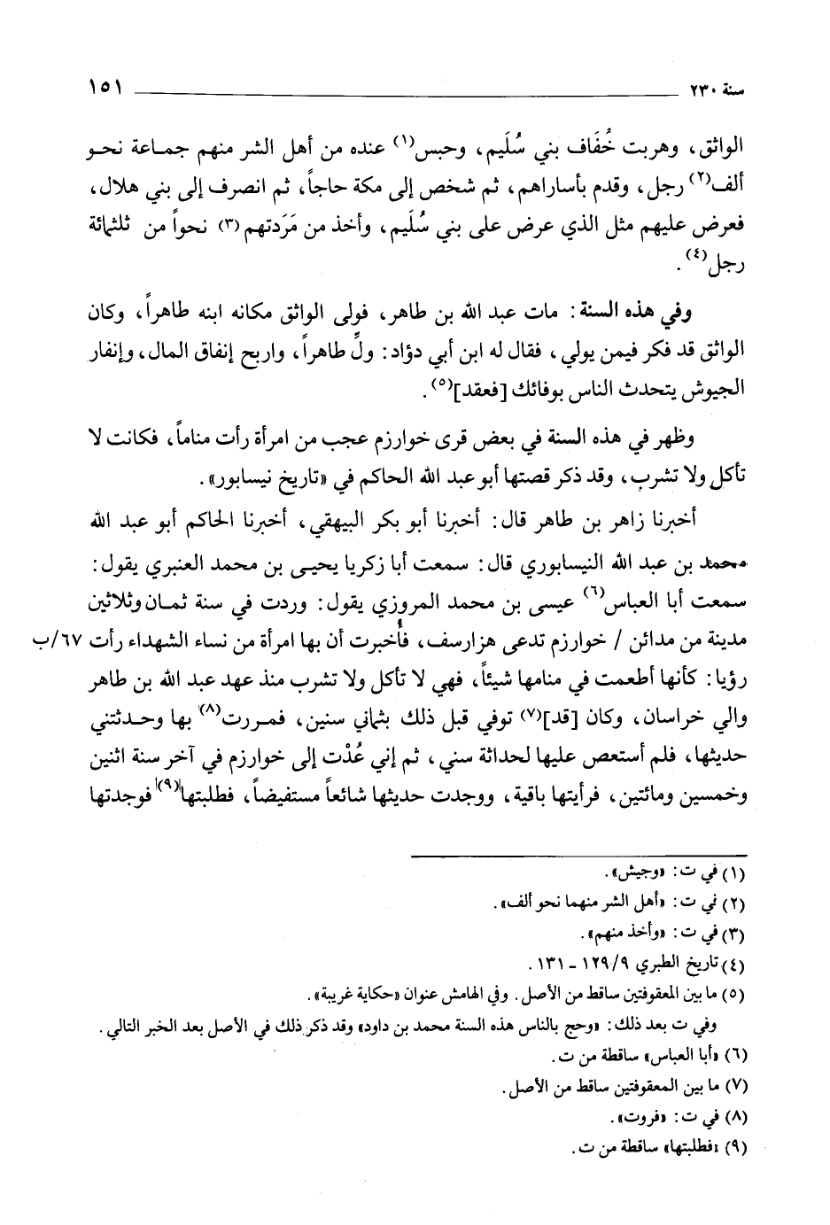 الواثق، وهربت خفاف بني سليم، وحبس [1] عنده من أهل الشر منهم جمَاعة نحو ألف [2] رجل، وقدم بأساراهم، ثم شخص إِلَى مكة حاجا، ثم انصرف إِلَى بني هلال، فعرض عليهم مثل الذي عرض عَلَى بني سليم، وأخذ من مردتهم [3] نحوا من ثلاثمائة رجل [4] .