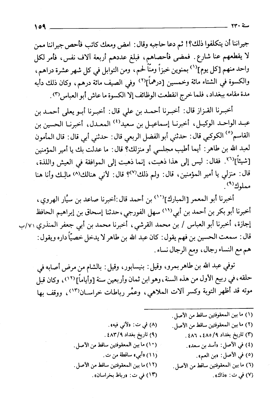 جيراننا أن يتكلفوا ذلك؟! ثم دعا حاجبه وقال: امض ومعك كاتب فأحص جيراننا ممن لا يقطعهم عنا شارع. فمضى فأحصاهم، فبلغ عددهم أربعة آلاف نفس، فأمر لكل واحد منهم [كل يوم] [1] بمنوين خبزا ومنا لحم، ومن التوابل فِي كل شهر عشرة دراهم، والكسوة فِي الشتاء مَائة وخمسين [درهمَا] [2] وفي الصيف مَائة درهم، وَكَانَ ذلك دأبه مدة مقامه ببغداد، فلمَا خرج انقطعت الوظائف إلا الكسوة مَا عاش أبو العباس [3] .