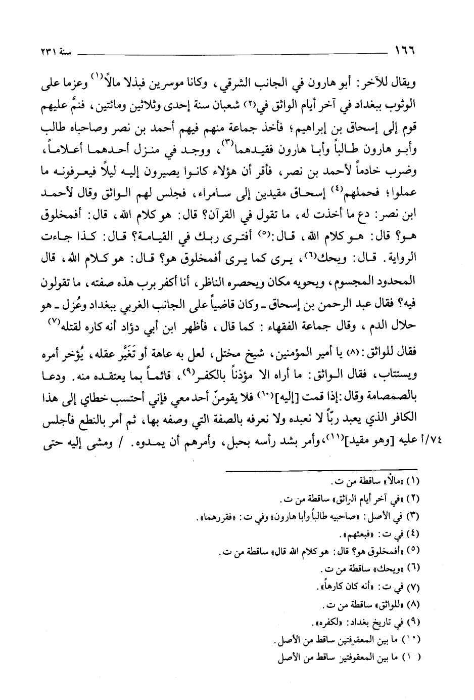 ويقال للآخر: أبو هارون فِي الجانب الشرقي، وكانا موسرين فبذلا مَالا [1] وعزمَا عَلَى الوثوب ببغداد فِي آخر أيام الواثق فِي [2] شعبان سنة إحدى وثلاثين ومَائتين، فنم عليهم قوم إِلَى إِسْحَاق بْن إبراهيم، فأخذ جمَاعة منهم فيهم أحمد بْن نصر وصاحباه طالب وأبو هارون طالبا وأبا هارون فقيدهمَا [3] ، ووجد فِي منزل أحدهمَا أعلامَا، وضرب خادمَا لأحمد بْن نصر، فأقر أن هؤلاء كانوا يصيرون إليه ليلا فيعرفونه مَا عملوا، فحملهم [4] إسحاق مقيدين إِلَى سامراء، فجلس لهم الواثق وقال لأحمد ابن نصر: دع مَا أخذت لَهُ، مَا تقول فِي القرآن؟ قَالَ: هُوَ كلام الله، قَالَ: أفمخلوق هُوَ؟ قَالَ: هُوَ كلام الله، قَالَ: [5] أفترى ربك فِي القيامة؟ قَالَ: كذا جاءت الرواية. قَالَ: ويحك [6] ، يرى كمَا يرى أفمخلوق هُوَ؟ قَالَ: هُوَ كلام الله، قَالَ المحدود المجسوم، ويحويه مكان ويحصره الناظر، أنا أكفر برب هَذِهِ صفته، مَا تقولون فِيهِ؟ فَقَالَ عَبْد الرَّحْمَنِ بْن إسحاق- وَكَانَ قاضيا عَلَى الجانب الغربي ببغداد وعزل- هُوَ حلال الدم، وقال جمَاعة الفقهاء: كمَا قَالَ، فأظهر ابْن أبي دؤاد أنه كاره لقتله [7] فَقَالَ للواثق: [8] يَا أَمِير الْمُؤْمِنِينَ، شيخ مختل، لعل به عاهة أو تغير عقله، يؤخر أمره ويستتاب، فقال الواثق: [8] يَا أَمِير الْمُؤْمِنِينَ، شيخ مختل، لعل به عاهة أو تغير عقله، يؤخر أمره ويستتاب، فَقَالَ الواثق: مَا أراه إلا مؤذنا بالكفر [9] ، قائمَا بمَا يعتقده منه. ودعا بالصمصامة وقال: إذا قمت [إليه] [10] فلا يقومن أحد معي فإنّي أحتسب خطاي إلى هذا الكافر الّذي يعبد ربا لا نعبده ولا نعرفه بالصفة التي وصفه بِهَا، ثم أمر بالنطع فأجلس 74/ أعليه [وهو مقيد] [11] ، وأمر بشد رأسه بحبل، وأمرهم أن يمدوه. / ومشى إليه حتى