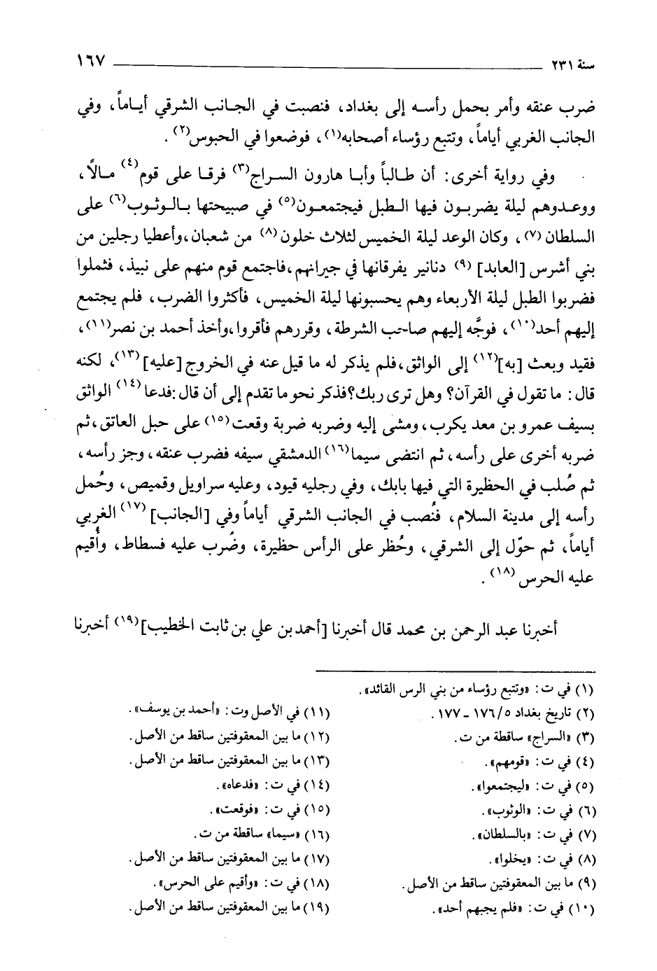 وفي رواية أخرى: أن طالبا وأبا هارون السراج [3] فرقا عَلَى قوم [4] مَالا، ووعدوهم ليلة يضربون فيها الطبل فيجتمعون [5] فِي صبيحتها بالوثوب [6] على السلطان [7] ، وكان الوعد ليلة الخميس لثلاث خلون [8] من شعبان، وأعطيا رجلين من بني أشرس [العابد] [9] دنانير يفرقانها فِي جيرانهم، فاجتمع قوم منهم عَلَى نبيذ، فثملوا فضربوا الطبل ليلة الأربعاء وهم يحسبونها ليلة الخميس، فأكثروا الضرب، فلم يجتمع إليهم أحد [10] ، فوجّه إليهم صاحب الشرطة، وقررهم فأقروا، وأخذ أحمد بْن نصر [11] ، فقيد وبعث [به] [12] إِلَى الواثق، فلم يذكر لَهُ مَا قيل عنه فِي الخروج [عَلَيْهِ] [13] ، لكنه قَالَ: مَا تقول فِي القرآن؟ وهل ترى ربك؟ فذكر نحو مَا تقدم إِلَى أن قَالَ: فدعا [14] الواثق بسيف عمرو بن معديكرب، ومشى إليه وضربه ضربة وقعت [15] عَلَى حبل العاتق، ثم ضربه أخرى عَلَى رأسه، ثم انتضى سيمَا [16] الدمشقي سيفه فضرب عنقه، وجز رأسه، ثم صلب فِي الحظيرة التي فيها بابك، وفي رجليه قيود، وعليه سراويل وقميص، وحمل رأسه إِلَى مدينة السَّلَام، فنصب فِي الجانب الشرقي أيامَا وفي [الجانب] [17] الغربي أيامَا، ثم حول إِلَى الشرقي، وحظر عَلَى الرأس حظيرة، وضرب عَلَيْهِ فسطاط، وأقيم عَلَيْهِ الحرس [18] .