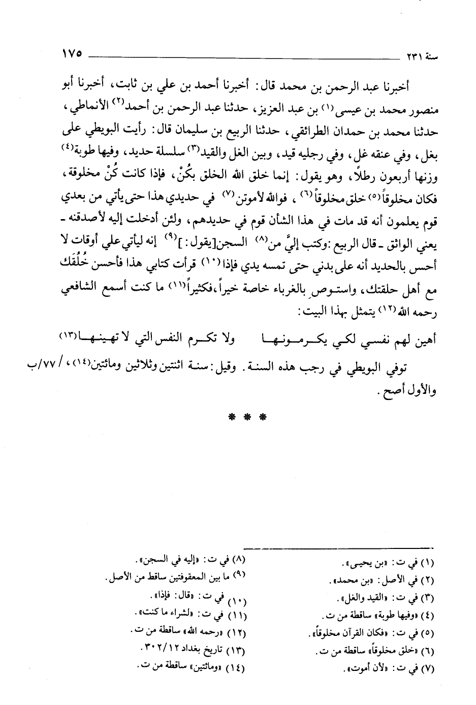 توفي البويطي فِي رجب هَذِهِ السنة. وقيل: سنة اثنتين وثلاثين ومائتين [14] ، / 77/ ب والأول أصح.