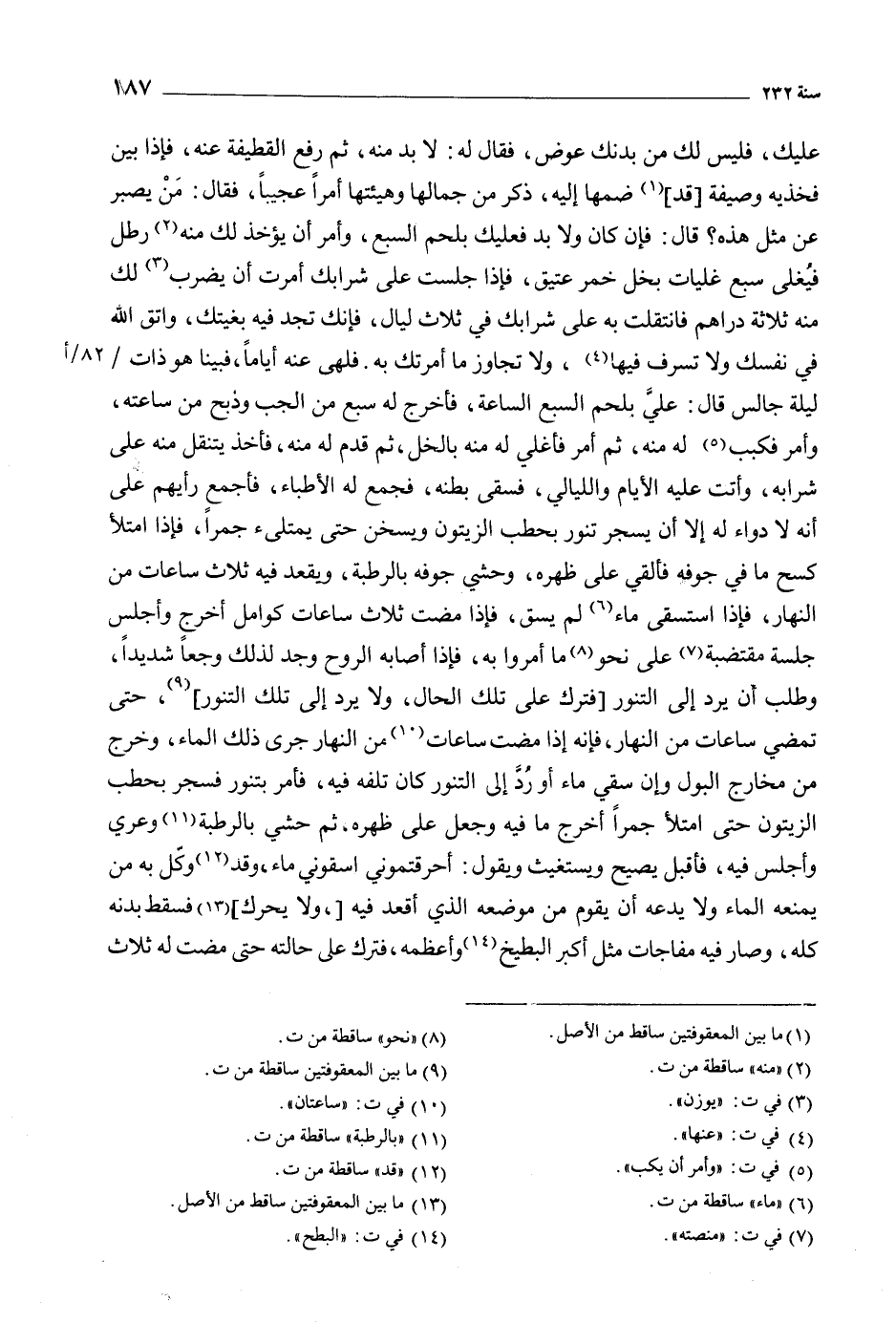 عليك، فليس لك من بدنك عوض، فَقَالَ لَهُ: لا بد منه، ثم رفع القطيفة عنه، فإذا بين فخذيه وصيفة [قد] [1] ضمها إليه، ذكر من جمَالها وهيئتها أمرا عجيبا، فَقَالَ: من يصبر عن مثل هَذِهِ؟ قَالَ: فَإِن كَانَ ولا بد فعليك بلحم السبع، وأمر أن يؤخذ لك منه [2] رطل فيغلى سبع غليات بخل خمر عتيق، فإذا جلست عَلَى شرابك أمرت أن يضرب [3] لك منه ثلاثة دراهم فانتقلت به عَلَى شرابك في ثلاث ليال، فإنك تجد فيه بغيتك، واتق الله فِي نفسك ولا تسرف فيها [4] ، ولا تجاوز مَا أمرتك به. فلهى عنه أيامَا، فبينا هو ذات/ 82/ أليلة جالس قَالَ: علي بلحم السبع الساعة، فأخرج لَهُ سبع من الجب وذبح من ساعته، وأمر فكبب [5] لَهُ منه، ثم أمر فأغلي لَهُ منه بالخل، ثم قدم لَهُ منه، فأخذ يتنقل منه عَلَى شرابه، وأتت عَلَيْهِ الأيام والليالي، فسقى بطنه، فجمع لَهُ الأطباء، فأجمع رأيهم عَلَى أنه لا دواء لَهُ إلا أن يسجر تنور بحطب الزيتون ويسخن حَتَّى يمتلئ جمرا، فإذا امتلأ كسح مَا فِي جوفه فألقي عَلَى ظهره، وحشي جوفه بالرطبة، ويقعد فيه ثلاث ساعات من النهار، فإذا استسقى ماء [6] لم يسق، فإذا مضت ثلاث ساعات كوامل أخرج وأجلس جلسة مقتضبة [7] عَلَى نحو [8] مَا أمروا به، فإذا أصابه الروح وجد لذلك وجعا شديدا، وطلب أن يرد إِلَى التنور [فترك عَلَى تلك الحال، ولا يرد إِلَى تلك التنور] [9] ، حَتَّى تمضي ساعات من النهار، فإنه إذا مضت ساعات [10] من النهار جرى ذلك المَاء، وخرج من مخارج البول وإن سقي ماء أو رد إِلَى التنور كَانَ تلفه فيه، فأمر بتنور فسجر بحطب الزيتون حَتَّى امتلأ جمرا أخرج مَا فيه وجعل عَلَى ظهره، ثم حشي بالرطبة [11] وعري وأجلس فيه، فأقبل يصيح ويستغيث وَيَقُولُ: أحرقتموني اسقوني مَاء، وقد [12] وكل به من يمنعه المَاء ولا يدعه أن يقوم من موضعه الّذي أقعد فيه [، ولا يحرك] [13] فسقط بدنه كله، وصار فيه مفاجآت مثل أكبر البطيخ [14] وأعظمه، فترك عَلَى حالته حَتَّى مضت لَهُ ثلاث
