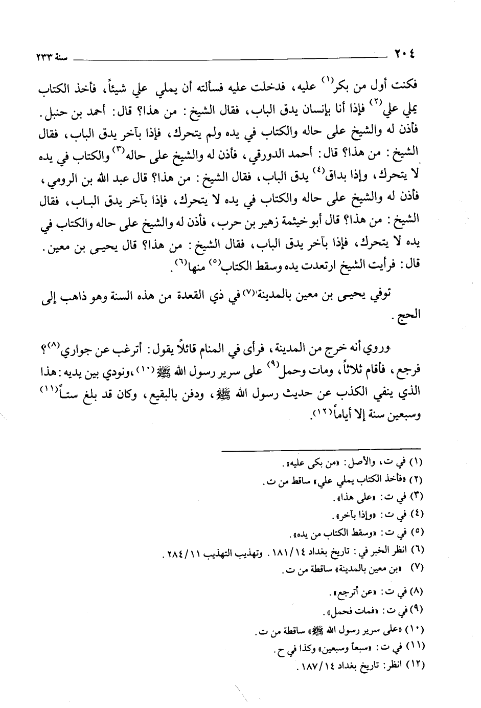 توفي يحيى بْن معين بالمدينة [7] فِي ذي القعدة من هَذِهِ السنة وَهُوَ ذاهب إِلَى الحج.