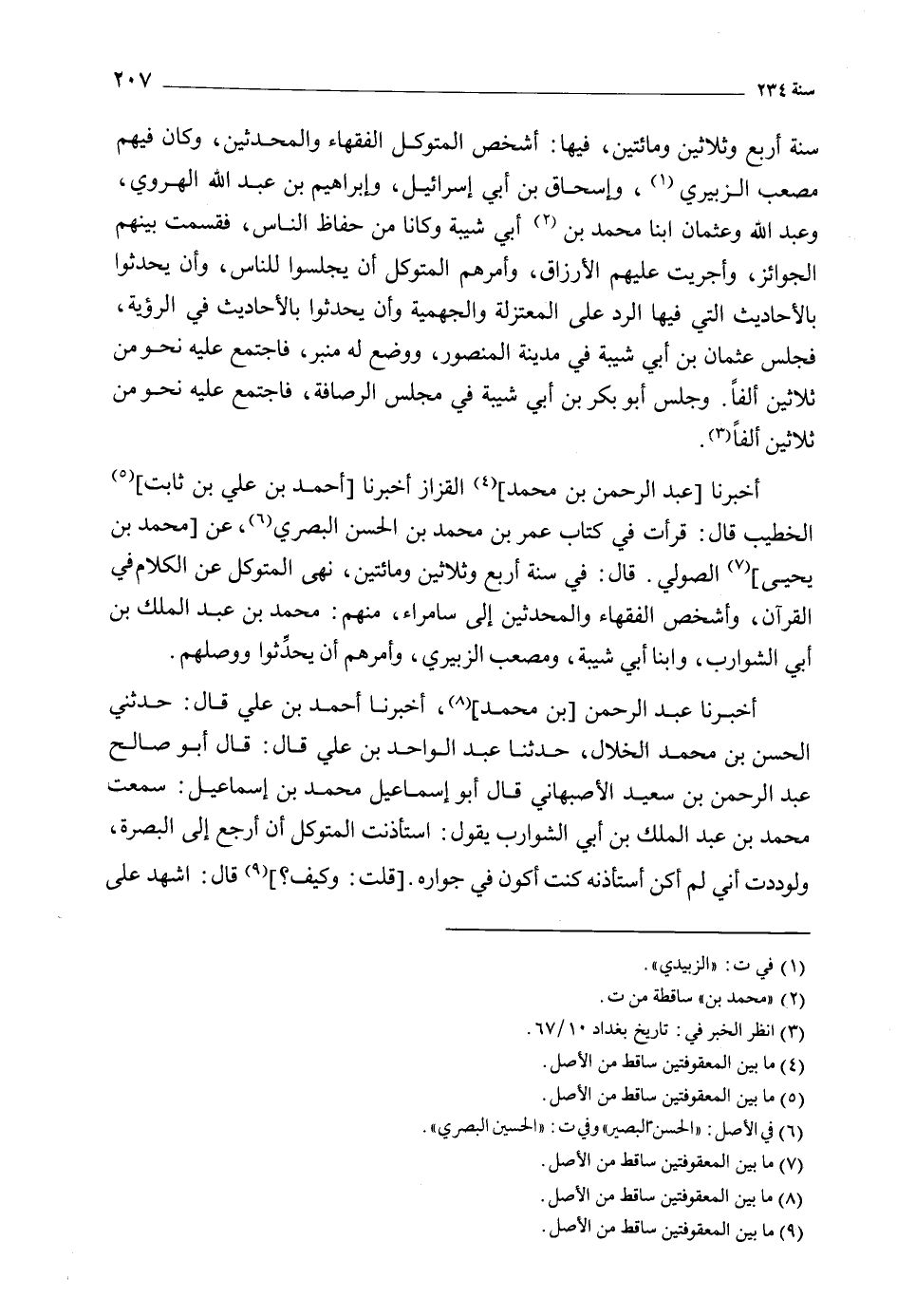 أخبرنا [عبد الرحمن بن محمد] [4] القزاز أخبرنا [أحمد بْن علي بْن ثابت] [5] الخطيب قَالَ: قرأت في كتاب عمر بن محمد بن الحسن البصري [6] ، عن [محمد بْن يحيى] [7] الصولي. قَالَ: فِي سنة أربع وثلاثين ومَائتين، نهى المتوكل عن الكلام فِي القرآن، وأشخص الفقهاء والمحدثين إِلَى سامراء، منهم: مُحَمَّد بْن عبد الملك بْن أبي الشوارب، وابنا أبي شيبة، ومصعب الزبيري، وأمرهم أن يحدثوا ووصلهم.