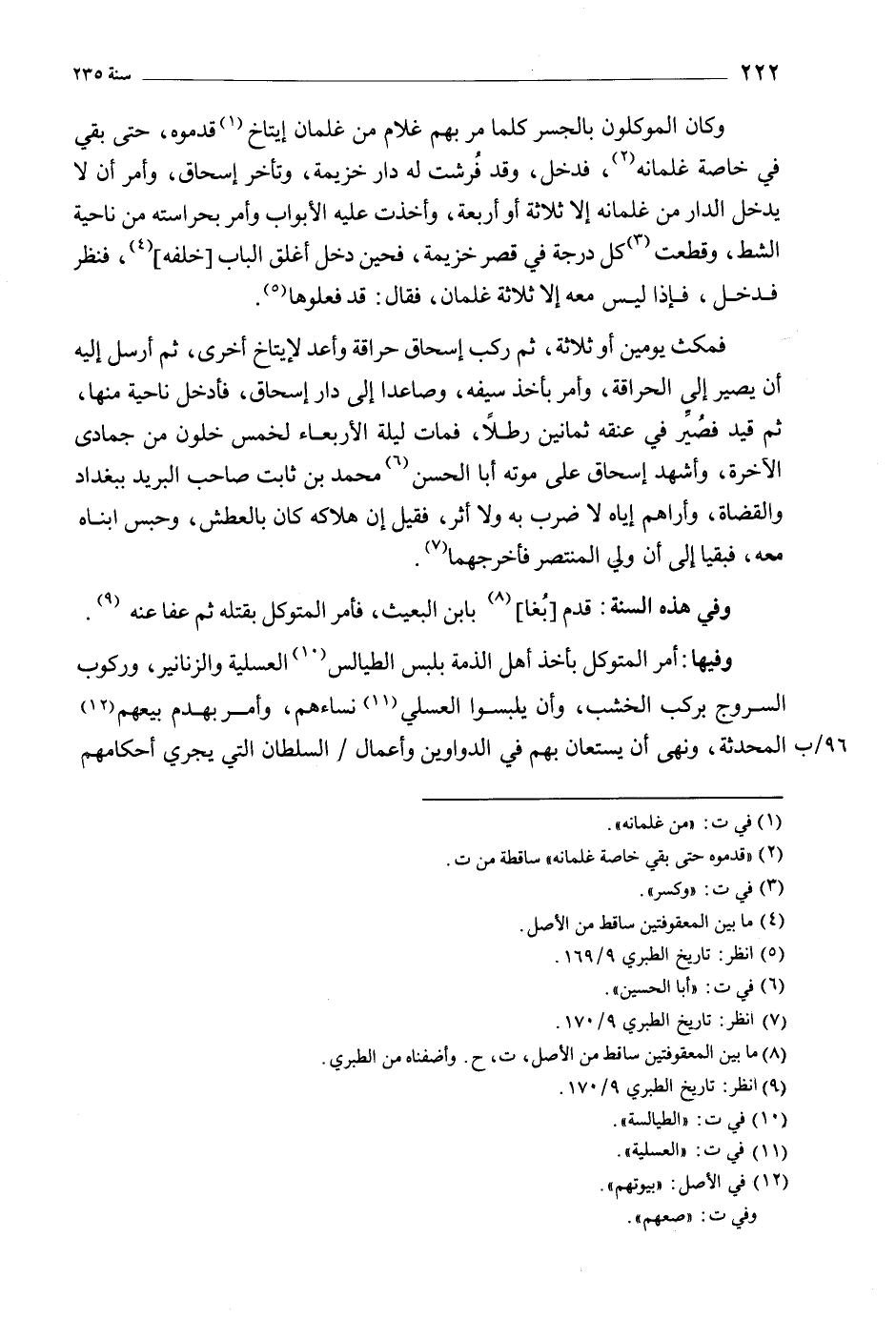 وفيها: أمر المتوكل بأخذ أهل الذمة بلبس الطيالس [10] العسلية والزنانير، وركوب السروج بركب الخشب، وأن يلبسوا العسلي [11] نساءهم، وأمر بهدم بيعهم [12] 96/ ب المحدثة، ونهى أن يستعان بهم فِي الدواوين وأعمال/ السلطان التي يجري أحكامهم