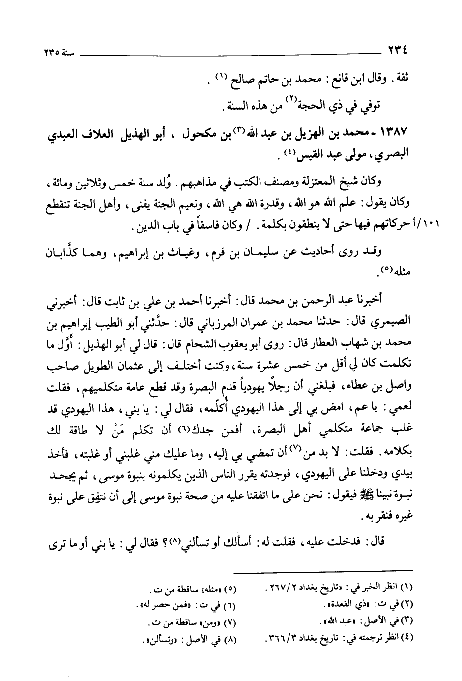 أَخْبَرَنَا عَبْد الرَّحْمَنِ بْن محمد قَالَ: أخبرنا أَحْمَدَ بْنِ عَلِيِّ بْنِ ثَابِتٍ قَالَ: أَخْبَرَنِي الصيمري قَالَ: حَدَّثَنَا مُحَمَّد بْن عمران المرزباني قَالَ: حدثني أبو الطيب إبراهيم بْن محمد بْن شهاب العَطَّار قَالَ: روى أبو يعقوب الشحام قَالَ: قَالَ لي أبو الهذيل: أول مَا تكلمت كَانَ لي أقل من خمس عشرة سنة، وكنت أختلف إِلَى عثمَان الطويل صاحب واصل بْن عطاء، فبلغني أن رجلا يهوديا قدم البصرة وقد قطع عامة متكلميهم، فقلت لعمي: يَا عم، امض بي إِلَى هَذَا اليهودي أكلمه، فَقَالَ لي: يَا بني، هَذَا اليهودي قد غلب جمَاعة متكلمي أهل البصرة، أفمن جدك [6] أن تكلم من لا طاقة لك بكلامه. فقلت: لا بد من [7] أن تمضي بي إليه، ومَا عليك مني غلبني أو غلبته، فأخذ بيدي ودخلنا عَلَى اليهودي، فوجدته يقرر الناس الذين يكلمونه بنبوة موسى، ثُمّ يجحد نبوة نبينا صَلَّى الله عليه وآله وَسَلَّمَ فيقول: نحن عَلَى مَا اتفقنا عَلَيْهِ من صحة نبوة موسى إِلَى أن نتفق على نبوة غيره فنقر به.