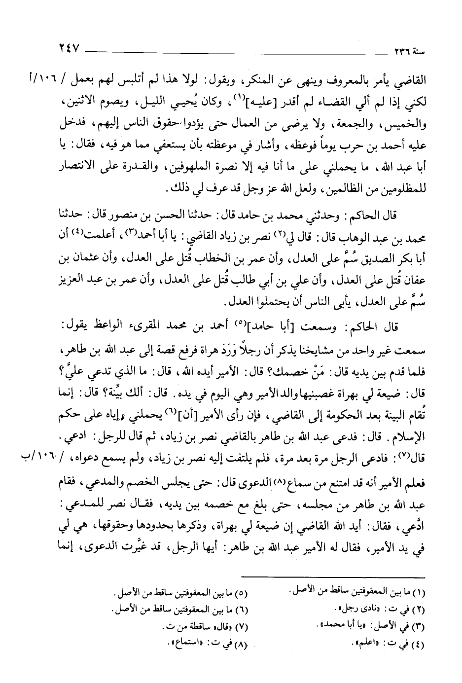 قَالَ [7] : فادعى الرجل مرة بعد مرة، فلم يلتفت إليه نصر بن زياد، ولم يسمع دعواه، / 106/ ب فعلم الأمير أنه قد امتنع من سمَاع [8] الدعوى قال: حتى يجلس الخصم والمدعي، فقام عبد الله بْن طاهر من مجلسه، حَتَّى بلغ مَعَ خصمه بين يديه، فقال نصر للمدعي: