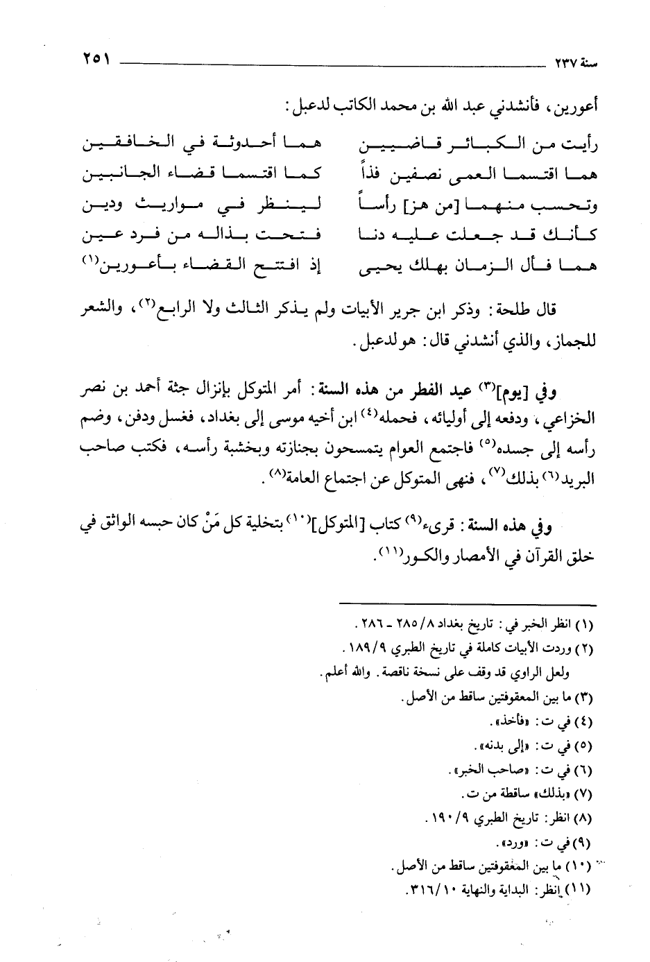 وفي [يوم] [3] عيد الفطر من هَذِهِ السنة: أمر المتوكل بإنزال جثة أحمد بْن نصر الخزاعي، ودفعه إِلَى أوليائه، فحمله [4] ابْن أخيه موسى إِلَى بغداد، فغسل ودفن، وضم رأسه إِلَى جسده [5] فاجتمع العوام يتمسحون بجنازته وبخشبة رأسه، فكتب صاحب البريد [6] بذلك [7] ، فنهى المتوكل عن اجتماع العامة [8] .