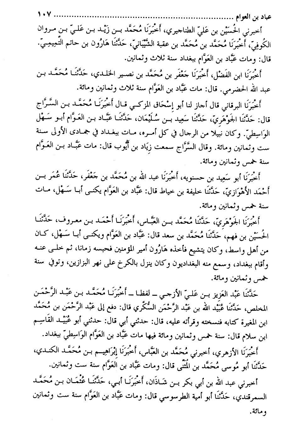 حَدَّثَنَا عَبْدُ العزيز بْن علي الأزجي- لفظا- أخبرنا محمّد بن عبد الرّحمن المخلص، حدثنا عبيد الله بن عبد الرحمن السكري قَالَ: دفع إلي عبد الرحمن بْن مُحَمَّد ابن المغيرة كتابه فنسخته وقرأته عليه، قَالَ: حَدَّثَنِي أَبِي قَالَ: حَدَّثَنِي أَبُو عبيد القاسم ابن سلام قَالَ: سنة خمس وثمانين ومائة فيها مات عباد بن العوام الواسطي ببغداد.