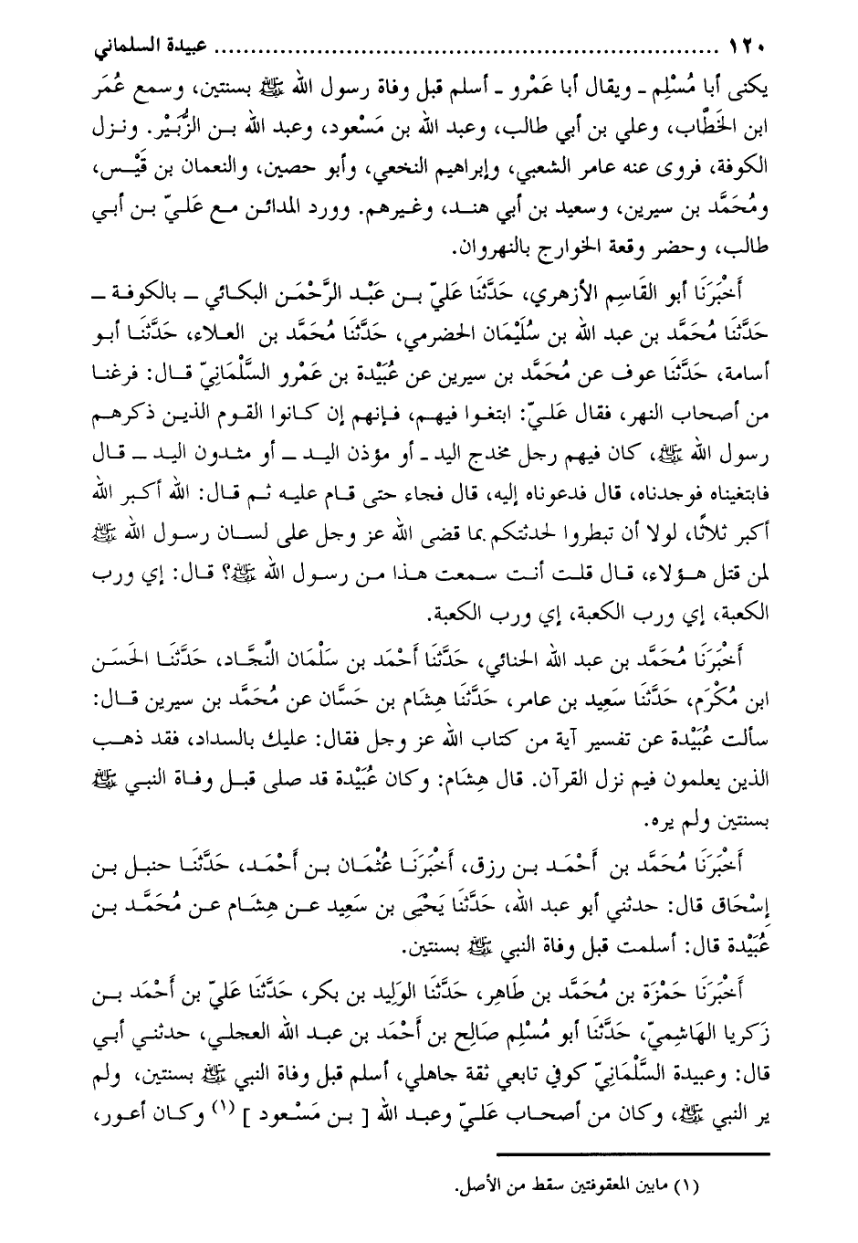 أَخْبَرَنَا حمزة بن محمد بن طاهر، حدّثنا الوليد بن بكر، حدثنا علي بن أحمد بن زكريا الهاشمي، حدثنا أبو مسلم صالح بن أحمد بن عبد الله العجلي، حَدَّثَنِي أبي قال: وعبيدة السلماني كوفي تابعي ثقة جاهلي، أسلم قبل وفاة النبي صَلَّى اللَّهُ عَلَيْهِ وَسَلَّمَ بسنتين، ولم ير النبي صَلَّى اللَّهُ عَلَيْهِ وَسَلَّمَ، وكان من أصحاب علي وعبد الله [بن مسعود] [1] وكان أعور،