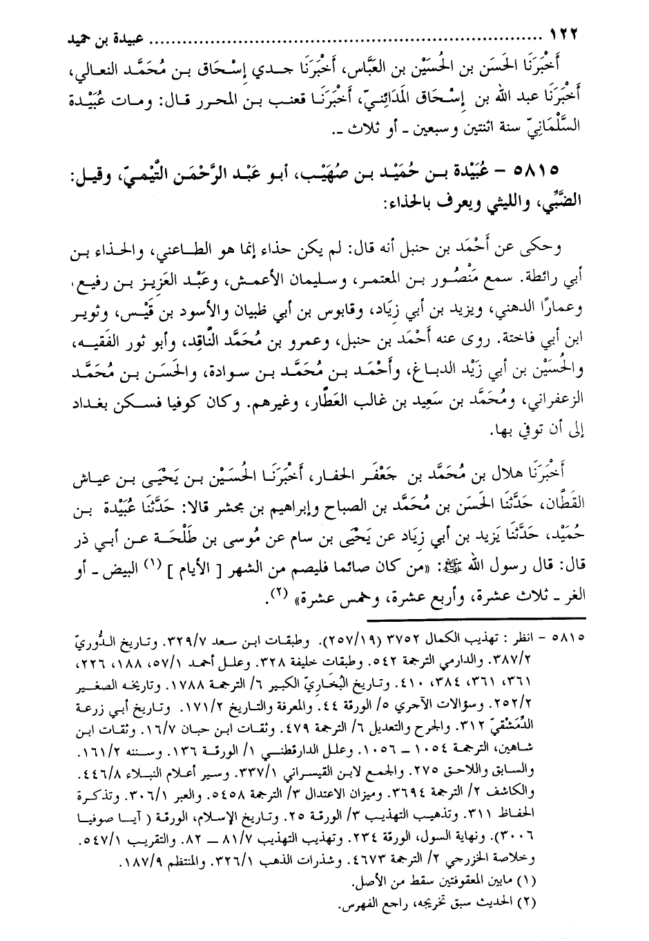 5815- عبيدة بن حميد بن صهيب، أبو عبد الرحمن التيمي، وقيل: الضبي، والليثي ويعرف بالحذاء [1] :