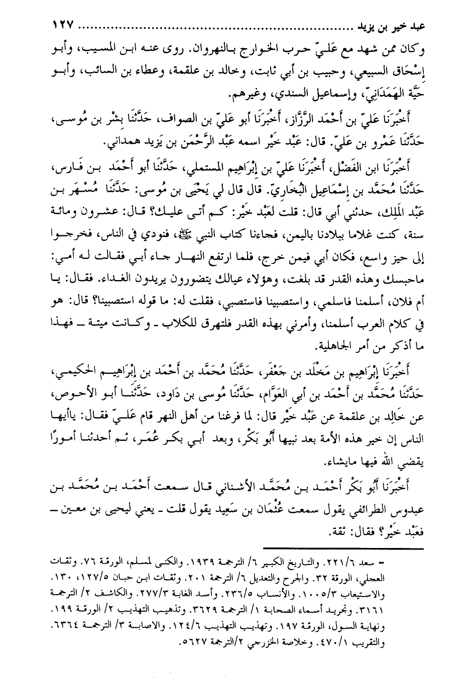 أخبرنا عليّ بن أحمد الرّزّاز، أخبرنا أبو عليّ بن الصواف، حدّثنا بشر بن موسى، حَدَّثَنَا عمرو بن علي. قال: عبد خير اسمه عبد الرحمن بن يزيد همداني.
