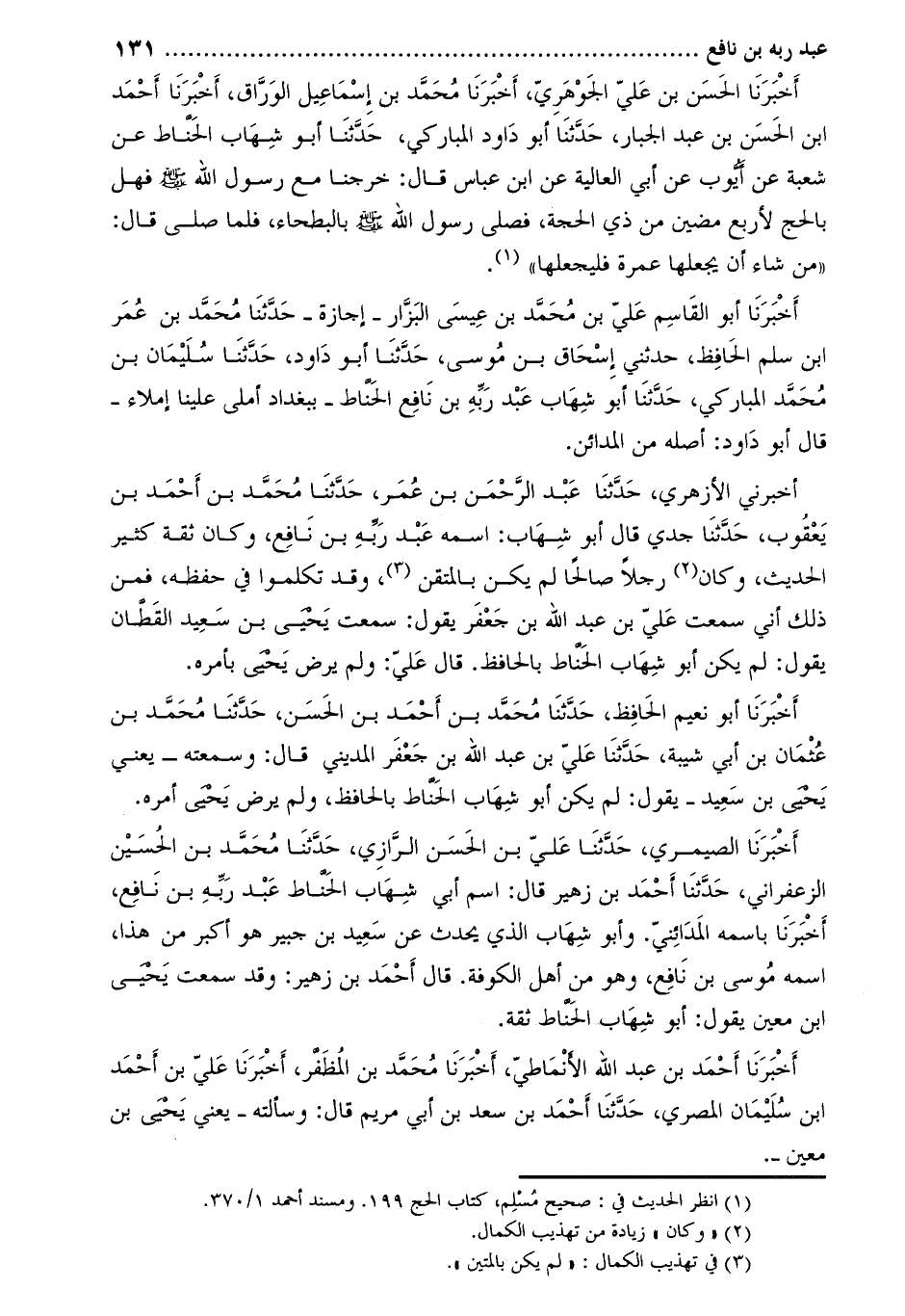 أخبرنا الصيمري، حدّثنا عليّ بن الحسن الرّازي، حدّثنا محمّد بن الحسين الزعفراني، حَدَّثَنَا أحمد بن زهير قال: اسم أبي شهاب الحناط عبد ربه بن نافع، أَخْبَرَنَا باسمه المدائني. وأبو شهاب الذي يحدث عن سعيد بن جبير هو أكبر من هذا، اسمه موسى بن نافع، وهو من أهل الكوفة. قال أحمد بن زهير: وقد سمعت يحيى ابن معين يقول: أبو شهاب الحناط ثقة.