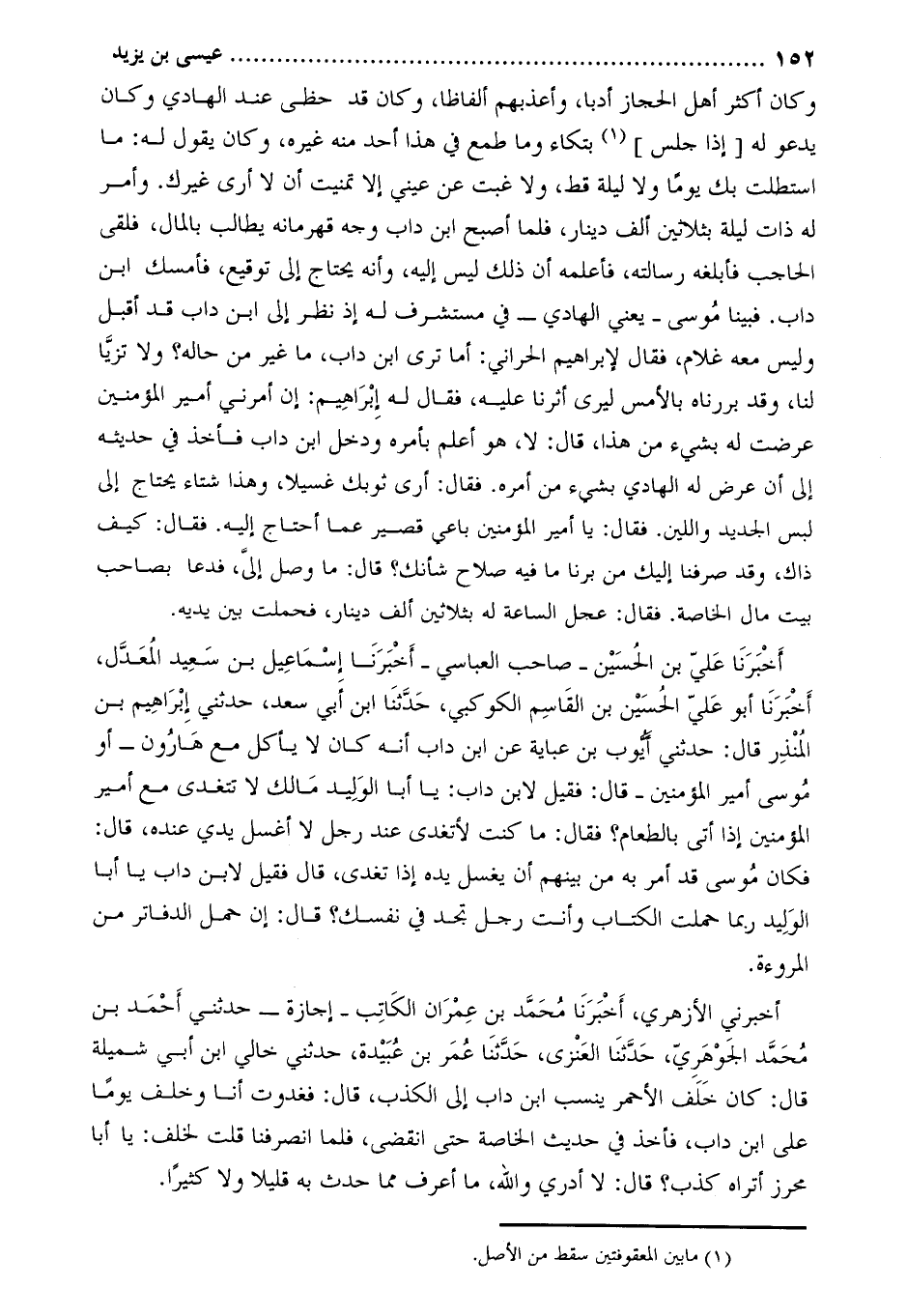 وكان أكثر أهل الحجاز أدبا، وأعذبهم ألفاظا، وكان قد حظى عند الهادي وكان يدعو له [إذا جلس] [1] بتكاء وما طمع في هذا أحد منه غيره، وكان يقول له: ما استطلت بك يوما ولا ليلة قط، ولا غبت عن عيني إلا تمنيت أن لا أرى غيرك. وأمر له ذات ليلة بثلاثين ألف دينار، فلما أصبح ابن داب وجه قهرمانه يطالب بالمال، فلقي الحاجب فأبلغه رسالته، فأعلمه أن ذلك ليس إليه، وأنه يحتاج إلى توقيع، فأمسك ابن داب. فبينا موسى- يعني الهادي- في مستشرف له إذ نظر إلى ابن داب قد أقبل وليس معه غلام، فقال لإبراهيم الحراني: أما ترى ابن داب، ما غير من حاله؟ ولا تزيّا لنا، وقد بررناه بالأمس ليرى أثرنا عليه، فقال له إبراهيم: إن أمرني أمير المؤمنين عرضت له بشيء من هذا، قال: لا، هو أعلم بأمره ودخل ابن داب فأخذ في حديثه إلى أن عرض له الهادي بشيء من أمره. فقال: أرى ثوبك غسيلا، وهذا شتاء يحتاج إلى لبس الجديد واللين. فقال: يا أمير المؤمنين باعي قصير عما أحتاج إليه. فقال: كيف ذاك، وقد صرفنا إليك من برنا ما فيه صلاح شأنك؟ قال: ما وصل إلى، فدعا بصاحب بيت مال الخاصة. فقال: عجل الساعة له بثلاثين ألف دينار، فحملت بين يديه.