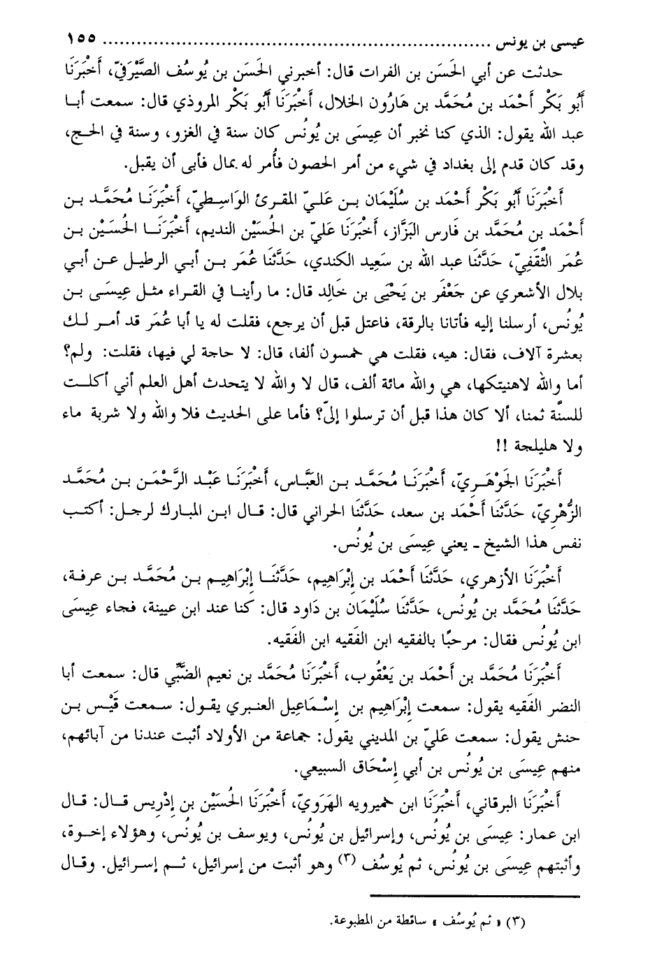 حدثت عَن أَبِي الْحَسَن بْن الفرات قَالَ: أخبرني الحسن بن يوسف الصّيرفيّ، أَخْبَرَنَا أَبُو بَكْرٍ أَحْمَدُ بْنُ مُحَمَّدِ بْنِ هارون الخلال، أَخْبَرَنَا أَبُو بَكْر المروذي قَالَ: سمعت أبا عَبْد الله يقول: الذي كنا نخبر أن عيسى بن يونس كان سنة في الغزو، وسنة في الحج، وقد كان قدم إلى بغداد في شيء من أمر الحصون فأمر له بمال فأبَى أن يقبل.