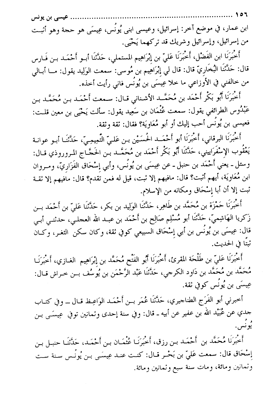 أَخْبَرَنَا حمزة بن محمد بن طاهر، حدّثنا الوليد بن بكر، حدثنا علي بن أحمد بن زكريا الهاشمي، حدثنا أبو مسلم صالح بن أحمد بن عبد الله العجلي، حَدَّثَنِي أبي قال: عِيسَى بْنُ يُونُسَ بْنِ أَبِي إِسْحَاقَ السَّبِيعِيُّ كوفي ثقة، وكان سكن الثغر، وكان ثبتا في الحديث.