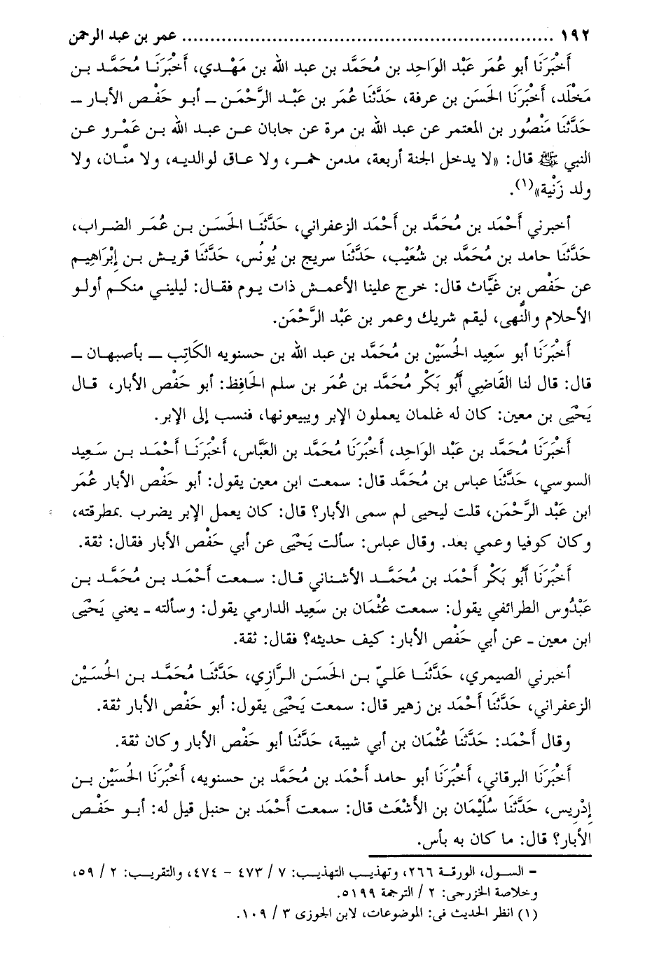 أَخْبَرَنَا مُحَمَّد بْن عَبْد الواحد، أخبرنا محمد بن العبّاس، أخبرنا أحمد بن سعيد السوسي، حَدَّثَنَا عَبَّاس بْن مُحَمَّد قَالَ: سمعت ابْن معين يقول: أبو حفص الأبار عمر ابن عَبْد الرَّحْمَن، قلت ليحيى لم سمي الأبار؟ قَالَ: كان يعمل الإبر يضرب بمطرقته، وكان كوفيا وعمي بعد. وقال عباس: سألت يَحْيَى عَن أَبِي حفص الأبار فقال: ثقة.