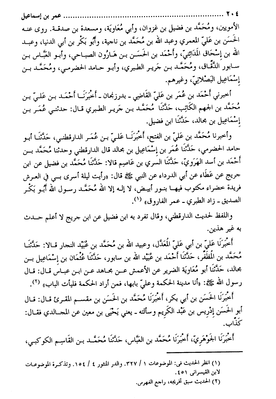 وأَخْبَرَنَا مُحَمَّدُ بْنُ عَلِيِّ بْنِ الْفَتْحِ، أَخْبَرَنَا عَلِيُّ بن عمر الدارقطني، حدّثنا أبو حامد الحضرمي، حَدَّثَنَا عُمَرُ بْنُ إِسْمَاعِيلَ بْنِ مُجَالِدٍ قَالَ الدَّارَقُطْنِيُّ وَحَدَّثَنَا مُحَمَّدُ بْنُ أَحْمَدَ بْنِ أَسَدٍ الهرويّ، حَدَّثَنَا السَّرِيُّ بْنُ عَاصِمٍ قَالا: حَدَّثَنَا مُحَمَّدُ بْنُ فُضَيْلٍ عَنِ ابْنِ جُرَيْجٍ عَنْ عَطَاءٍ عَنْ أَبِي الدَّرْدَاءِ عَنِ النَّبِيِّ صَلَّى اللَّهُ عَلَيْهِ وَسَلَّمَ قَالَ: «رَأَيْتُ لَيْلَةَ أُسْرِيَ بِي فِي الْعَرْشِ فَرِيدَةً خَضْرَاءَ مَكْتُوبٌ فِيهَا بِنُورٍ أَبْيَضَ، لا إِلَهَ إِلا اللَّهُ مُحَمَّدٌ رَسُولُ اللَّهِ أَبُو بَكْرٍ الصِّدِّيقُ- زَادَ الطَّبَرِيُّ- عُمَرُ الْفَارُوقُ» [1] .