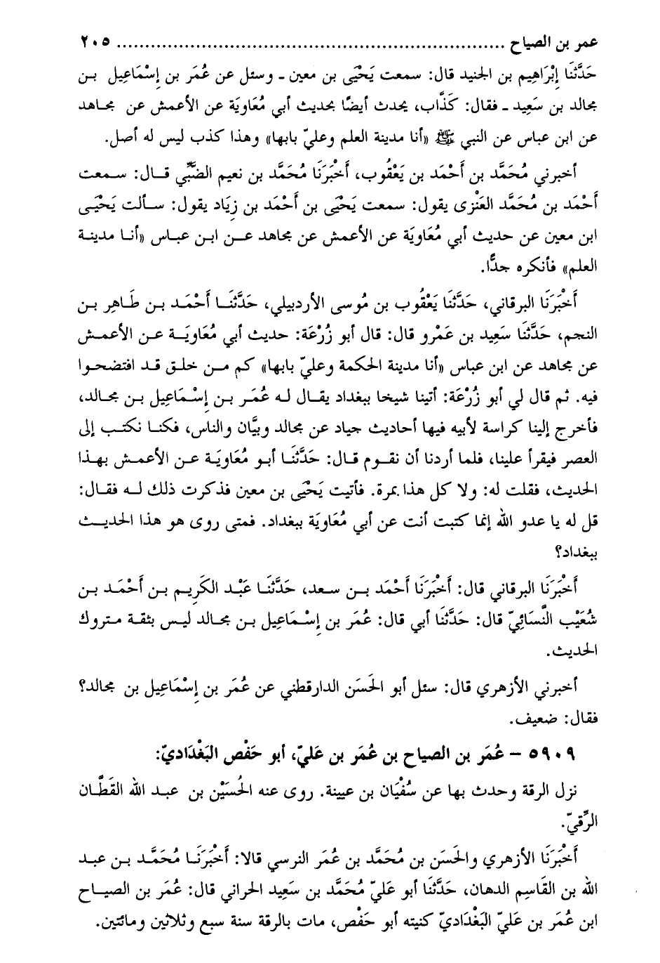 حَدَّثَنَا إبراهيم بْن الجنيد قَالَ: سمعت يحيى بْنَ مَعِينٍ- وَسُئِلَ عَنْ عُمَرَ بْنِ إِسْمَاعِيلَ بْنِ مُجَالِدِ بْنِ سَعِيدٍ- فَقَالَ: كَذَّابٌ، يُحَدِّثُ أَيْضًا بِحَدِيثِ أَبِي مُعَاوِيَةَ عَنِ الأَعْمَشِ عَنْ مُجَاهِدٍ عَنِ ابْنِ عَبَّاسٍ عَنِ النَّبِيِّ صَلَّى اللَّهُ عَلَيْهِ وَسَلَّمَ «أَنَا مَدِينَةُ الْعِلْمِ وَعَلِيٌّ بَابُهَا»
