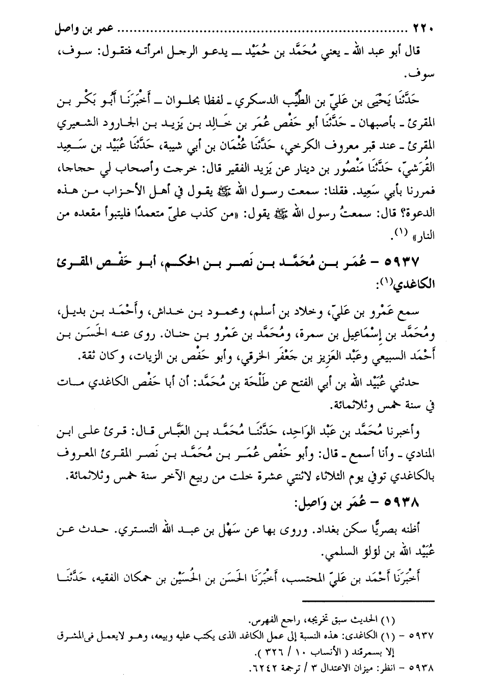 5937- عُمَر بْن مُحَمَّد بْن نصر بْن الحكم، أَبُو حفص المقرئ الكاغدي [2] :