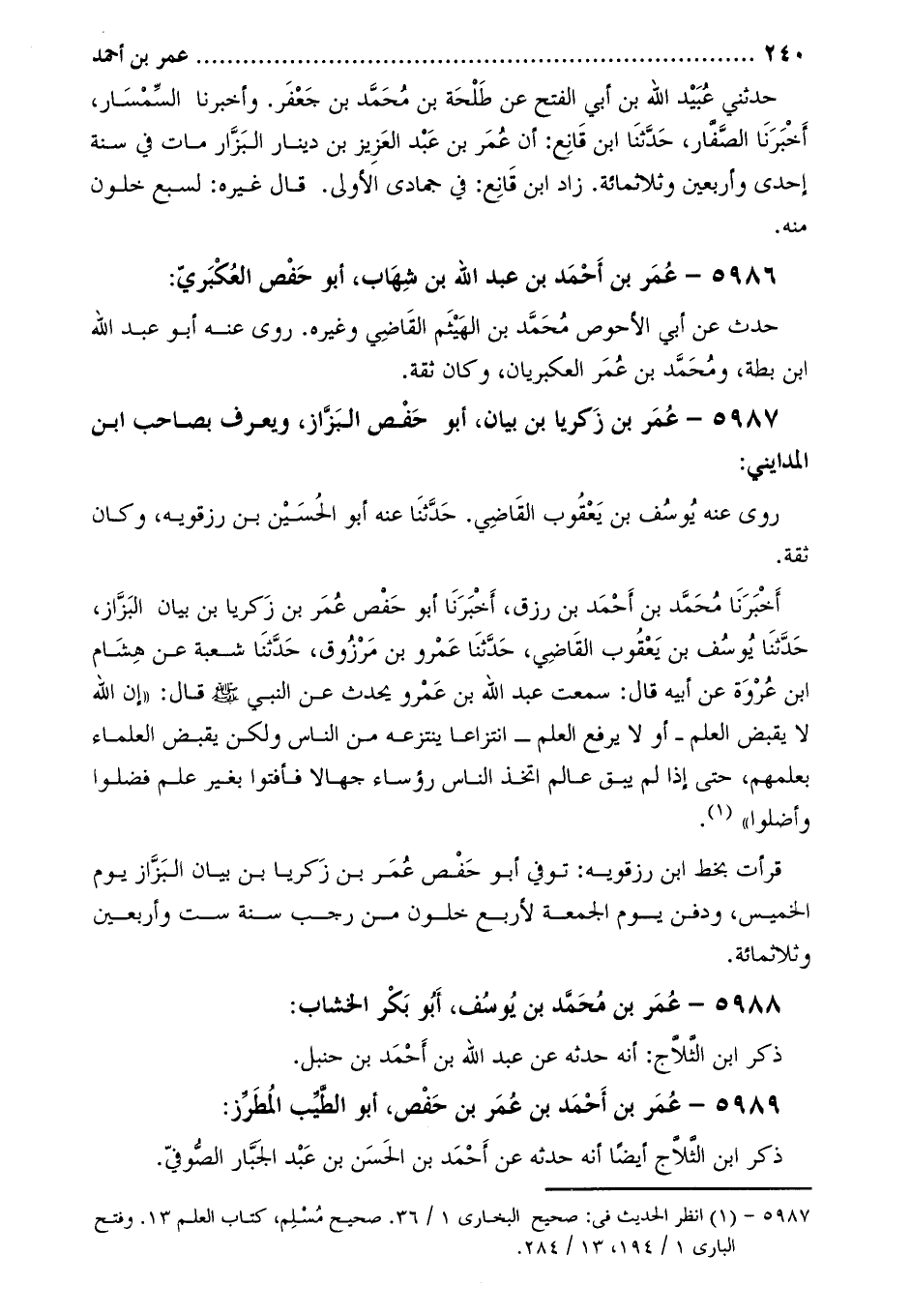 5987- عُمَر بْن زكريا بْن بيان، أَبُو حفص البزّاز، ويعرف بصاحب ابن المدايني: