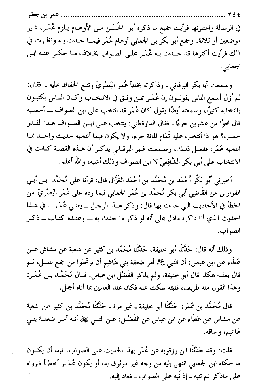 فِي الرسالة واعتبرتها فرأيت جميع ما ذكره أَبُو الحسن من الأوهام يلزم عُمَر، غير موضعين أو ثلاثة. وجمع أَبُو بكر بْن الجعابي أوهام عُمَر فيما حدث به ونظرت في ذلك فرأيت أكثرها قد حدث به عُمَر على الصواب بخلاف ما حكى عنه ابن الجعابي.