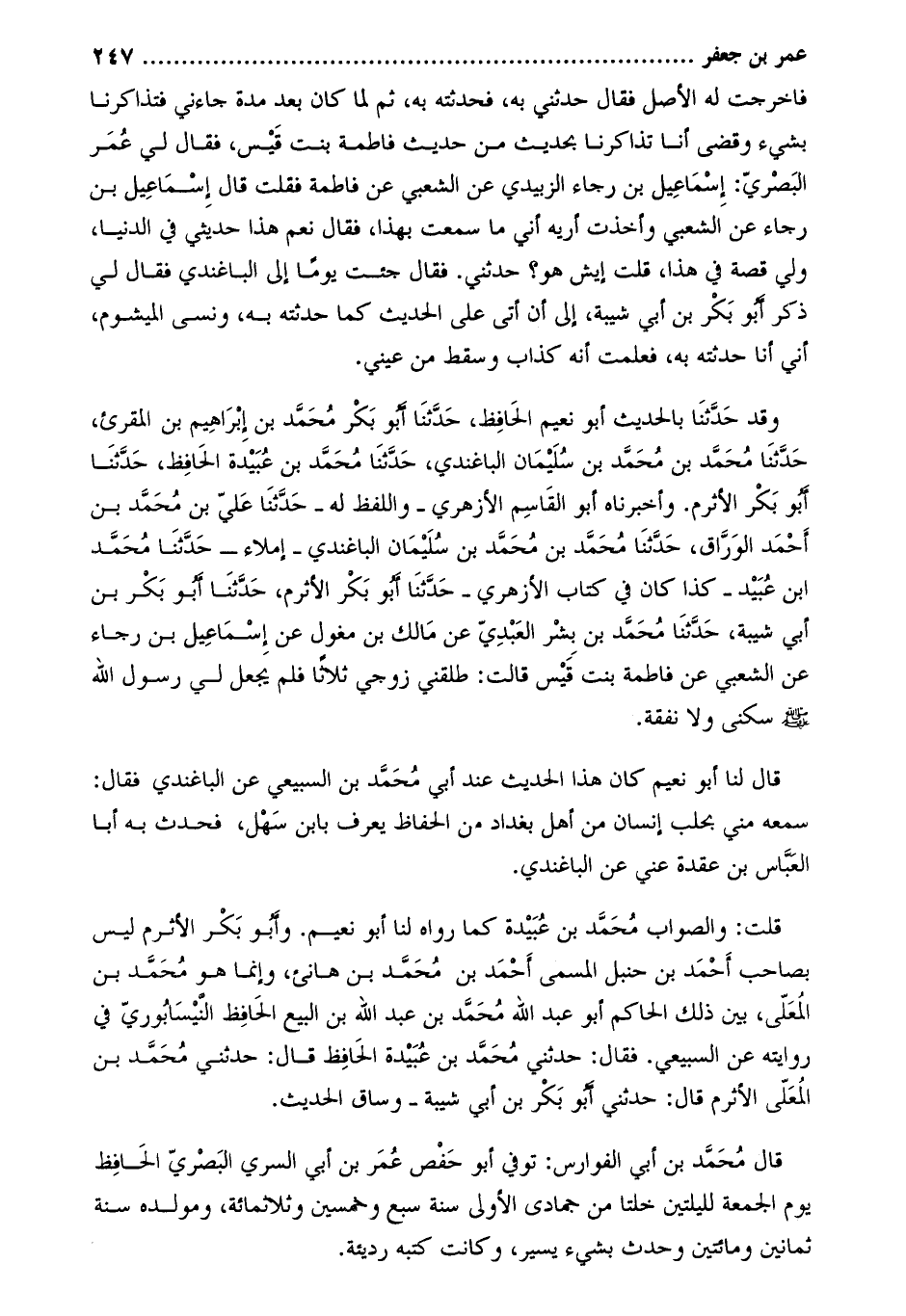 قلت: والصواب مُحَمَّد بْن عبيدة كما رواه لنا أَبُو نعيم. وأبو بكر الأثرم ليس بصاحب أَحْمَد بْن حنبل المسمى أَحْمَد بْن مُحَمَّد بْن هانئ، وإنما هو مُحَمَّد بْن المعلى، بين ذلك الحاكم أَبُو عَبْد اللَّه مُحَمَّد بْن عَبْد اللَّه بْن البيع الحافظ النيسابوري فِي روايته عَن السبيعي. فقال: حَدَّثَنِي مُحَمَّد بْن عبيدة الحافظ قَالَ: حَدَّثَنِي مُحَمَّد بْن المعلى الأثرم قَالَ: حَدَّثَنِي أبو بكر بن أبي شيبة- وساق الحديث.