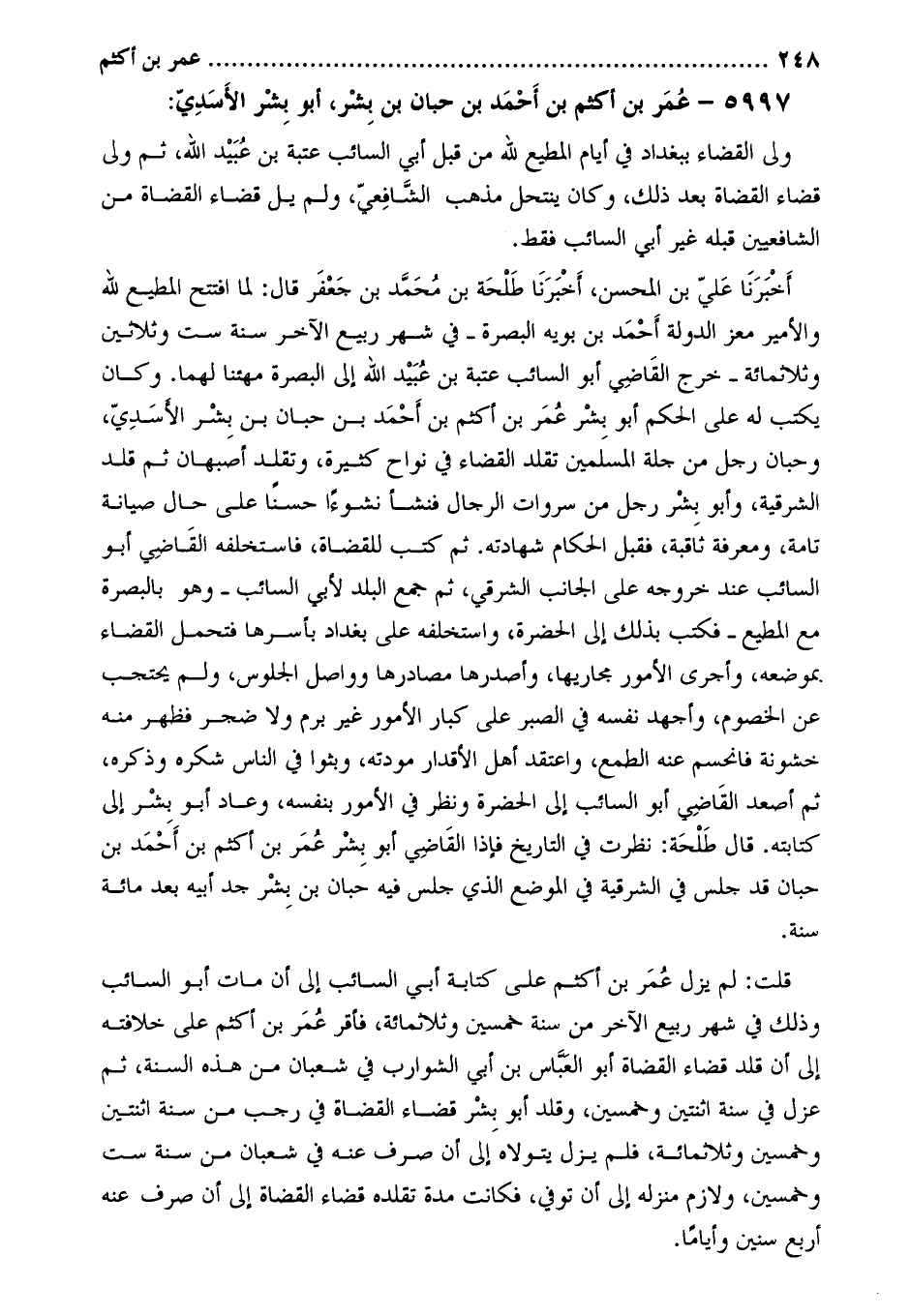 أَخْبَرَنَا علي بْن المحسن، أَخْبَرَنَا طلحة بْن مُحَمَّد بْن جعفر قَالَ: لما افتتح المطيع لله والأمير معز الدوله أَحْمَد بْن بويه البصرة- فِي شهر ربيع الآخر سنة ست وثلاثين وثلاثمائة- خرج القاضي أَبُو السائب عتبة بْن عبيد الله إلى البصرة مهنئا لهما. وكان يكتب له على الحكم أَبُو بشر عُمَر بْن أكثم بْن أحمد بن حبان بن بشر الأسديّ، وحبان رجل من جلة المسلمين تقلد القضاء فِي نواح كثيرة، وتقلد أصبهان ثم قلد الشرقية، وأبو بشر رجل من سروات الرجال فنشأ نشوءا حسنا على حال صيانة تامة، ومعرفة ثاقبة، فقبل الحكام شهادته. ثم كتب للقضاة، فاستخلفه القاضي أَبُو السائب عند خروجه على الجانب الشرقي، ثم جمع البلد لأبي السائب- وهو بالبصرة مع المطيع- فكتب بذلك إِلَى الحضرة، واستخلفه على بَغْدَاد بأسرها فتحمل القضاء بموضعه، وأجرى الأمور مجاريها، وأصدرها مصادرها وواصل الجلوس، ولم يحتجب عَن الخصوم، وأجهد نفسه فِي الصبر على كبار الأمور غير برم ولا ضجر فظهر منه خشونة فانحسم عنه الطمع، واعتقد أهل الأقدار مودته، وبثوا فِي الناس شكره وذكره، ثم أصعد القاضي أَبُو السائب إِلَى الحضرة ونظر فِي الأمور بنفسه، وعاد أَبُو بشر إِلَى كتابته. قَالَ طلحة: نظرت فِي التاريخ فإذا القاضي أَبُو بشر عُمَر بْن أكثم بن أحمد بن حبان قد جلس فِي الشرقية فِي الموضع الذي جلس فيه حبان بْن بشر جد أبيه بعد مائة سنة.