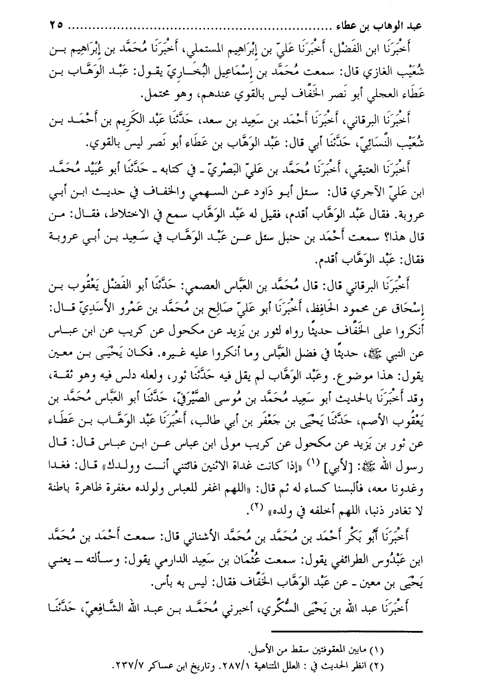 . أَخْبَرَنَا أَبُو بَكْرٍ أَحْمَدُ بْنُ مُحَمَّدِ بْنِ محمد الأشناني قَالَ: سمعت أحمد بن محمد ابن عبدوس الطرائفي يقول: سمعت عثمان بن سعيد الدارمي يقول: وسألته- يعني يحيى بن معين- عن عبد الوهاب الخفاف فقال: ليس به بأس.