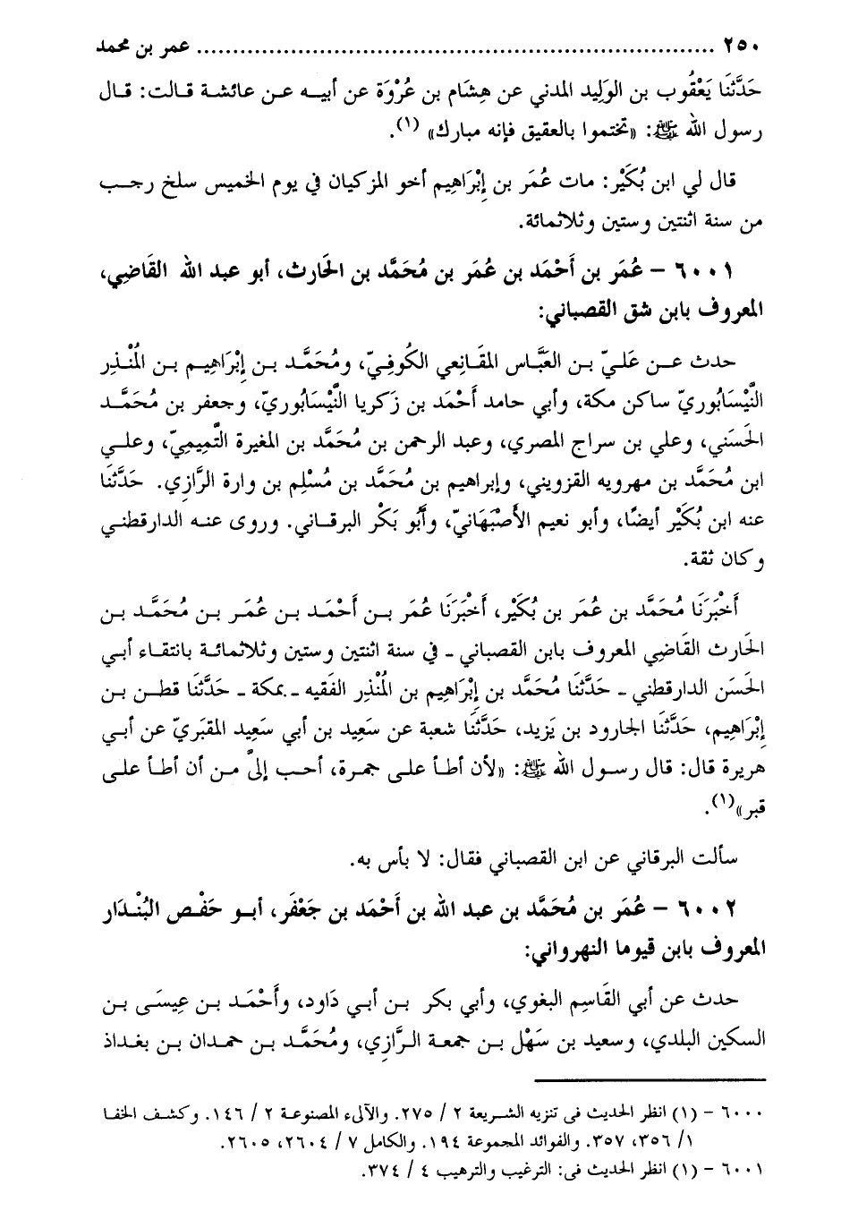 6001- عُمَرُ بْنُ أَحْمَدَ بْنِ عُمَرَ بْنِ مُحَمَّدِ بْن الحارث، أَبُو عَبْد اللَّه القاضي، المعروف بابن شق القصباني: