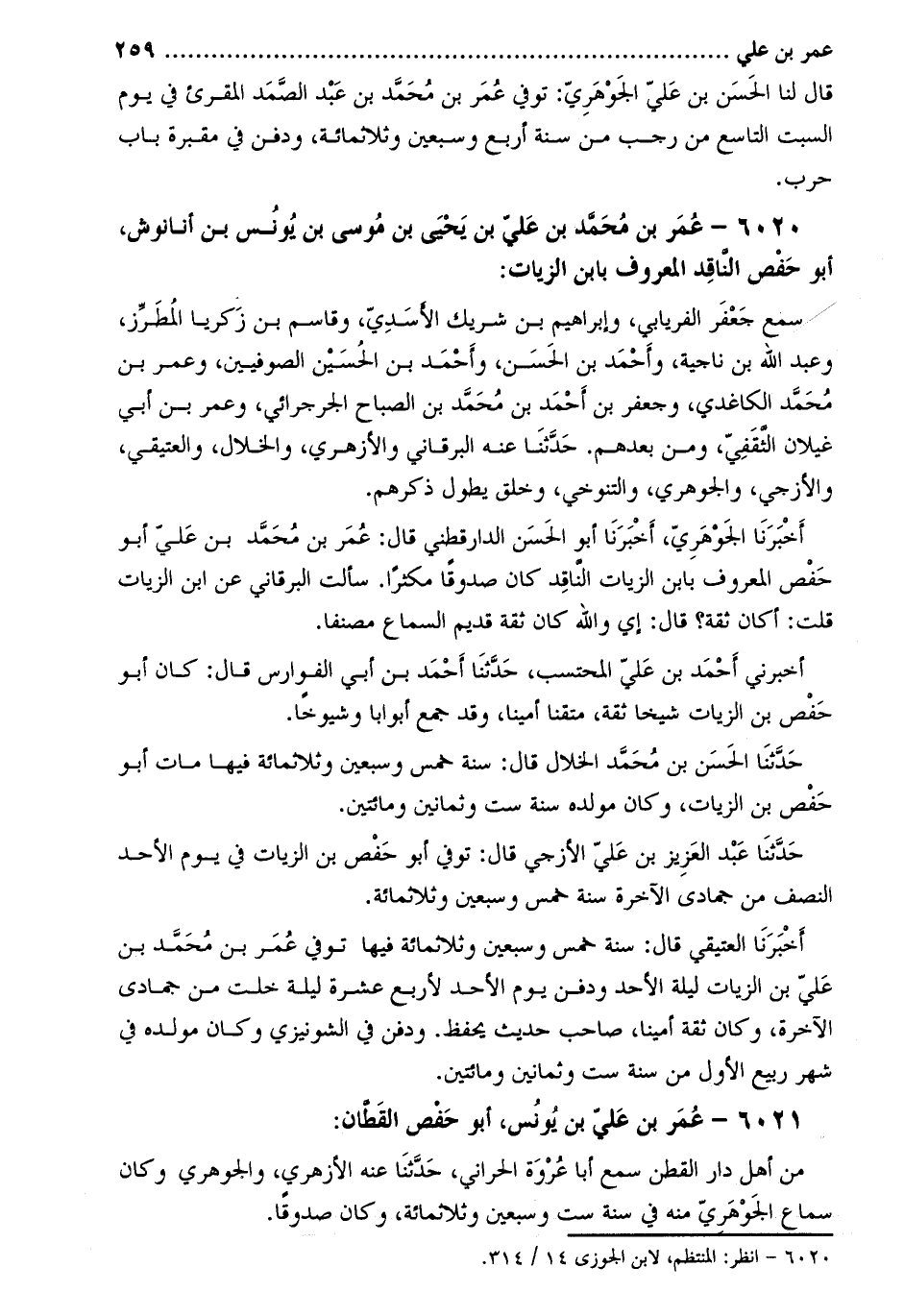 6020- عُمَر بْن مُحَمَّد بْن علي بْن يَحْيَى بْن مُوسَى بْن يونس بْن أنانوش، أَبُو حفص الناقد المعروف بابن الزيات [1] :
