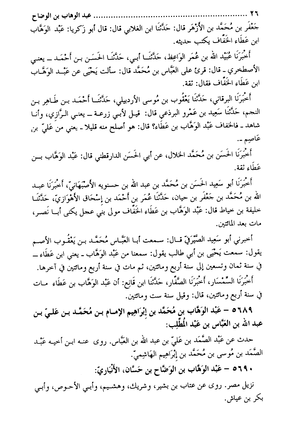 أَخْبَرَنَا أبو سعيد الحسن بْن مُحَمَّد بْن عَبْد اللَّهِ بْن حسنويه الأصبهانيّ، أخبرنا عَبْدُ اللَّهِ بْنُ مُحَمَّدِ بْنِ جَعْفَرِ بْنِ حيان، حَدَّثَنَا عُمَر بْن أَحْمَد بْن إِسْحَاقَ الأهوازي، حَدَّثَنَا خليفة بن خياط قال: عبد الوهاب بن عطاء الخفاف مولى بني عجل يكنى أبا نصر، مات بعد المائتين.