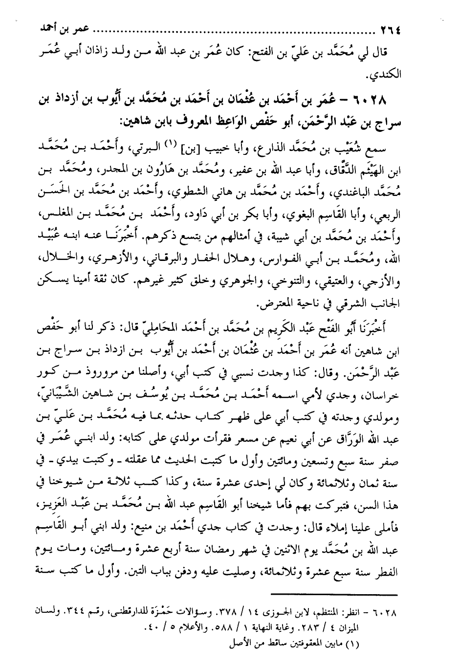 6028- عُمَر بْن أَحْمَدَ بْن عُثْمَان بْن أَحْمَدَ بْن مُحَمَّد بْن أَيُّوب بْن أزداذ بْن سراج بْن عَبْد الرَّحْمَن، أَبُو حفص الواعظ المعروف بابن شاهين [1] :