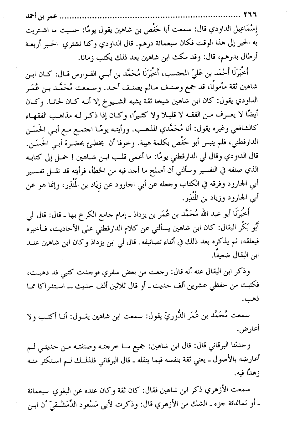 قَالَ الداودي وقال لي الدارقطني يوما: ما أعمى قلب ابن شاهين! حمل إلي كتابه الذي صنفه فِي التفسير وسألني أن أصلح ما أجد فيه من الخطأ، فرأيته قد نقل تفسير أَبِي الجارود وفرقه فِي الكتاب وجعله عَن أَبِي الجارود عَن زياد بْن المنذر، وإنما هو عن أبي الجارود وزياد بْن المنذر.